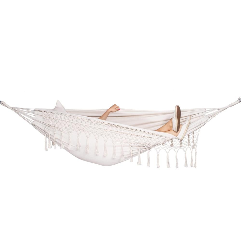 Culoare: nuante de bej Dimensiuni: 200x150 cm Material: bumbac, poliester Sarcina maxima: 200 kg Franjuri la moda Doua perne incluse Instructiuni de asamblare incluse in set Hamacul este fabricat din materiale naturale, inclusiv bumbac, care garanteaza permeabilitatea maxima a aerului. Materialul usor, dar durabil, se adapteaza perfect la corp, permitand utilizatorului sa se odihneasca si sa se relaxeze complet pe el. Hamacul are bucle de agatat pe ambele parti, astfel incat il puteti agata oriunde. Atunci cand este pliat, ocupa foarte putin spatiu, astfel incat sa il luati cu dvs. in vacanta nu este o problema. Instructiunile de asamblare sunt incluse. Greutatea maxima admisa de utilizare este de 200 kg. Material moale si durabil Se adapteaza perfect corpului Permeabilitate maxima la aer Instalare oriunde Instructiuni de instalare incluse in kit Franjuri la moda Doua perne incluse