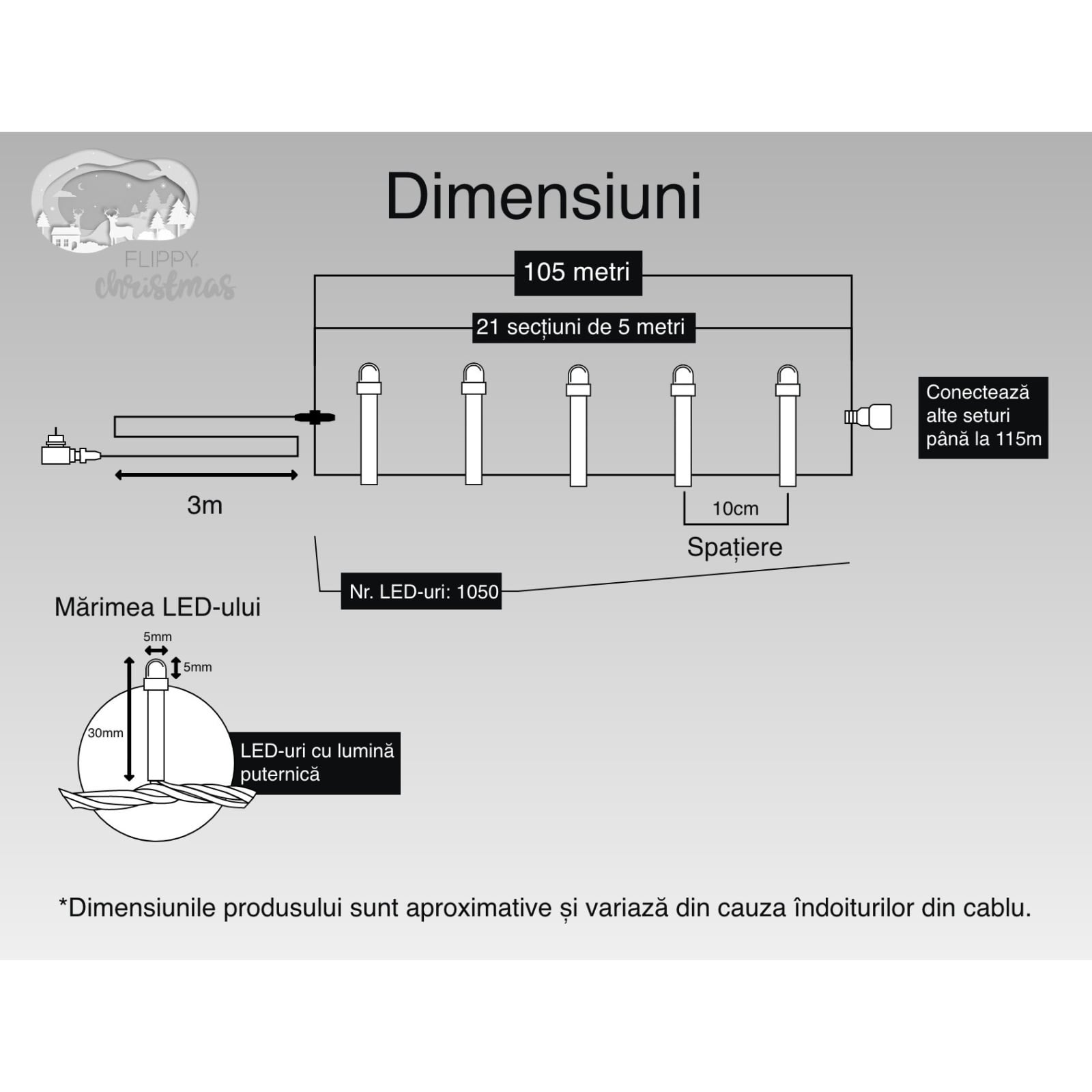 Instalatie Craciun, 105 m, 1050 Led-uri ,Liniara, Rosu/Albastru/Rosu/Verde, Flash, Transformator cu telecomanda, Interconectabila, Prelungitor 3 m inclus, Fir Verde,