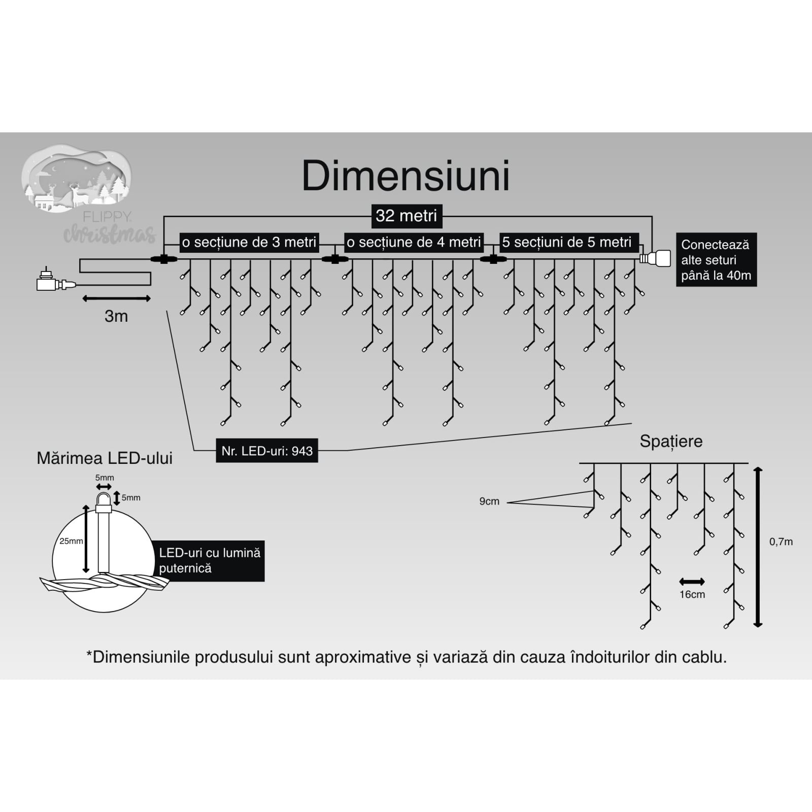 Suprafata luminoasa are un total de 30 m metri. Lungimea prelungitorului este de 3 m. Ofera posibilitatea de a suspenda ghirlanda astfel incat sa poata fi ascuns cablul de alimentare atunci cand este conectat la priza.