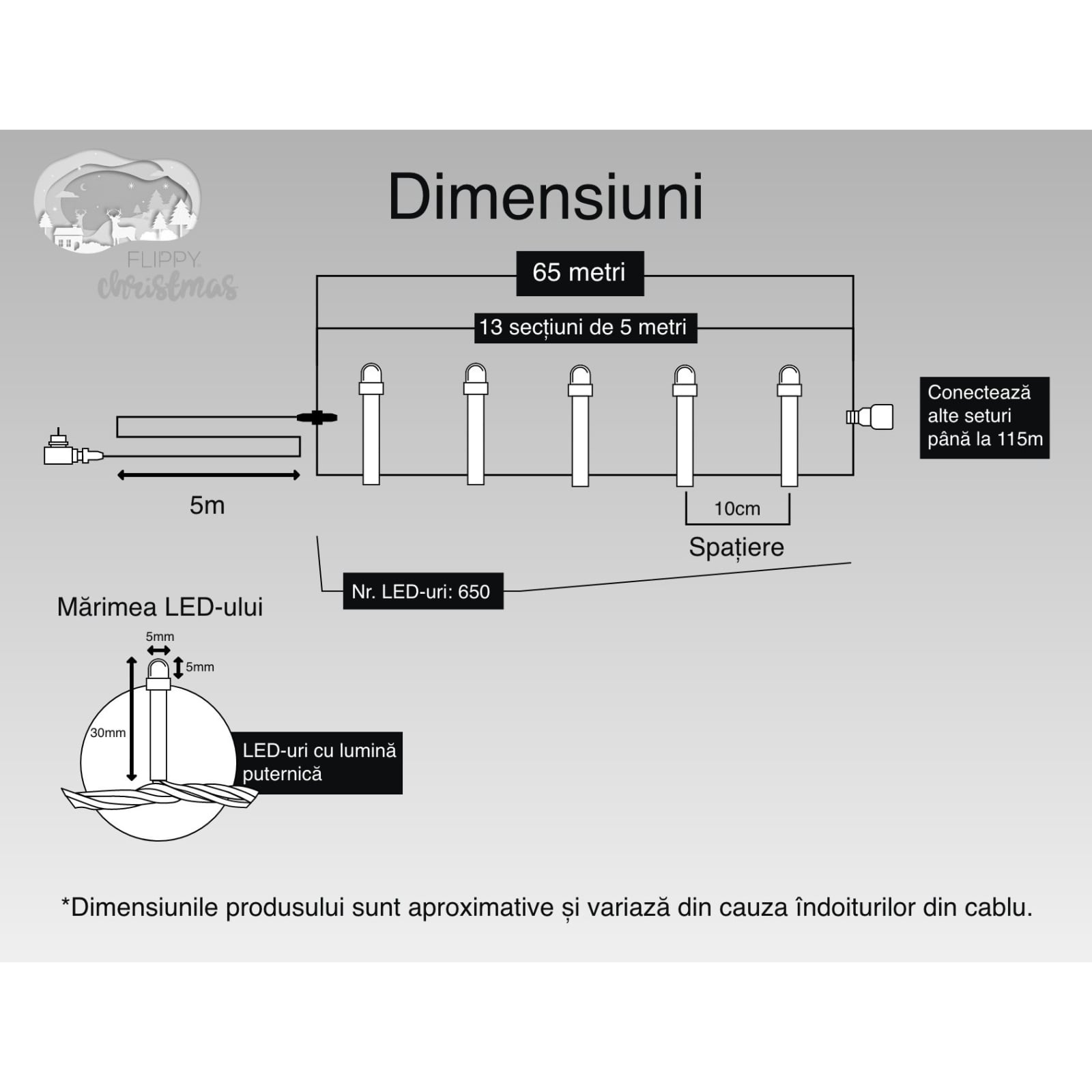Instalatie Craciun, 65 m, 650 Led-uri ,Liniara, Rosu/Albastru/Rosu/Verde, Flash, Transformator, Interconectabila, Prelungitor 5 m inclus, Fir Verde,