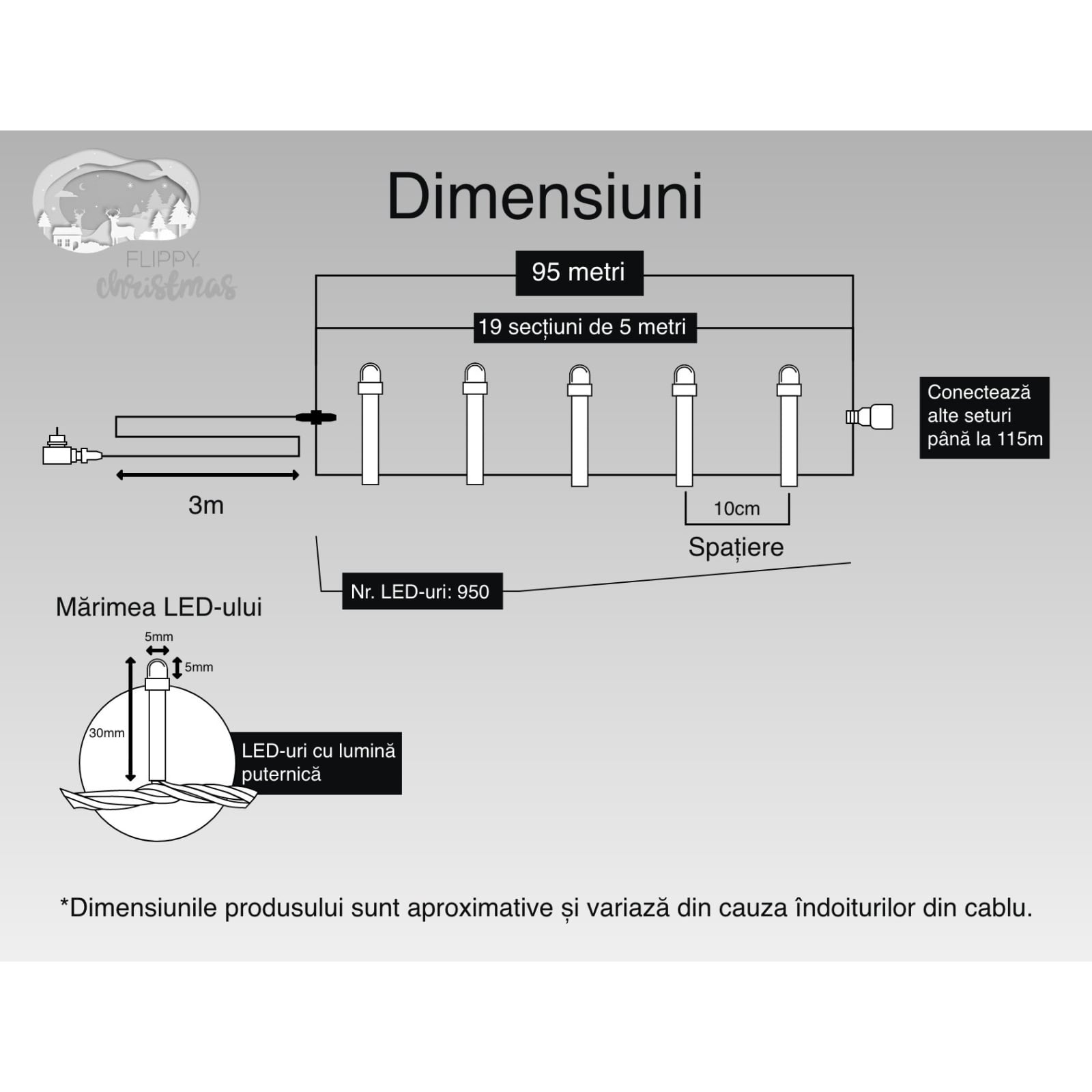 Instalatie Craciun, 95 m, 950 Led-uri ,Liniara, Rosu/Albastru/Rosu/Verde, Flash, Transformator cu telecomanda, Interconectabila, Prelungitor 3 m inclus, Fir Verde,