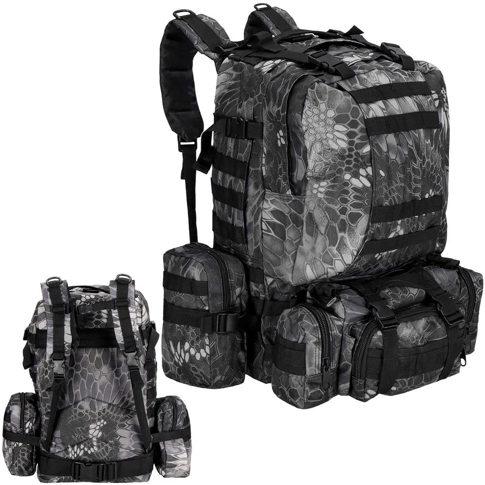 Material: poliester Catarame cu clichet: plastic Capacitate: 50L Rezistent la apa Inchidere: fermoar Buzunare laterale detasabile Dimensiuni: Inaltime totala 50 cm Latime totala 50 cm Adancime totala 40 cm Latimea compartimentului principal 30 cm Sistem de transport reglabil: 40 - 67 cm Catarama de centura reglabila: 36 - 70 cm  Rucsacul nostru a fost dotat cu numeroase compartimente suplimentare, detasabile, un sistem Molle de neinlocuit, sisteme de transport reglabile, o centura pentru solduri si o serie de alte avantaje: Rezistent la apa - materialul din poliester, in plus fata de interiorul cauciucat, asigura o protectie adecvata Sistem Molle - permite depozitarea si montarea altor accesorii importante Amelioreaza presiunea asupra coloanei vertebrale si a umerilor in timpul utilizarii Maner de transport - in partea superioara a rucsacului Catarame de blocare - continutul rucsacului este foarte bine protejat Buzunar ascuns 2x compartimente principale - foarte incapatoare In plus fata de compartimentul principal spatios, am echipat rucsacul nostru cu compartimente si buzunare suplimentare. Ca urmare, fiecare obiect din echipamentul dvs. isi va gasi locul in rucsac. In ciuda dimensiunilor sale mai mari, produsul are o greutate redusa, astfel incat confortul de utilizare este intotdeauna la un nivel ridicat. Rucsacul este dotat cu accesorii practice, care cu siguranta va vor fi de folos in timpul calatoriilor si vor creste confortul de utilizare: Curele reglabile: curele de sold si de umar. Elemente de spuma - pe spate si pe curelele de umar Buzunar ascuns pe spate Catarame din plastic, durabile Baza cauciucata a compartimentului principal Interiorul cauciucat al compartimentelor suplimentare Maner superior pentru al purta in mana