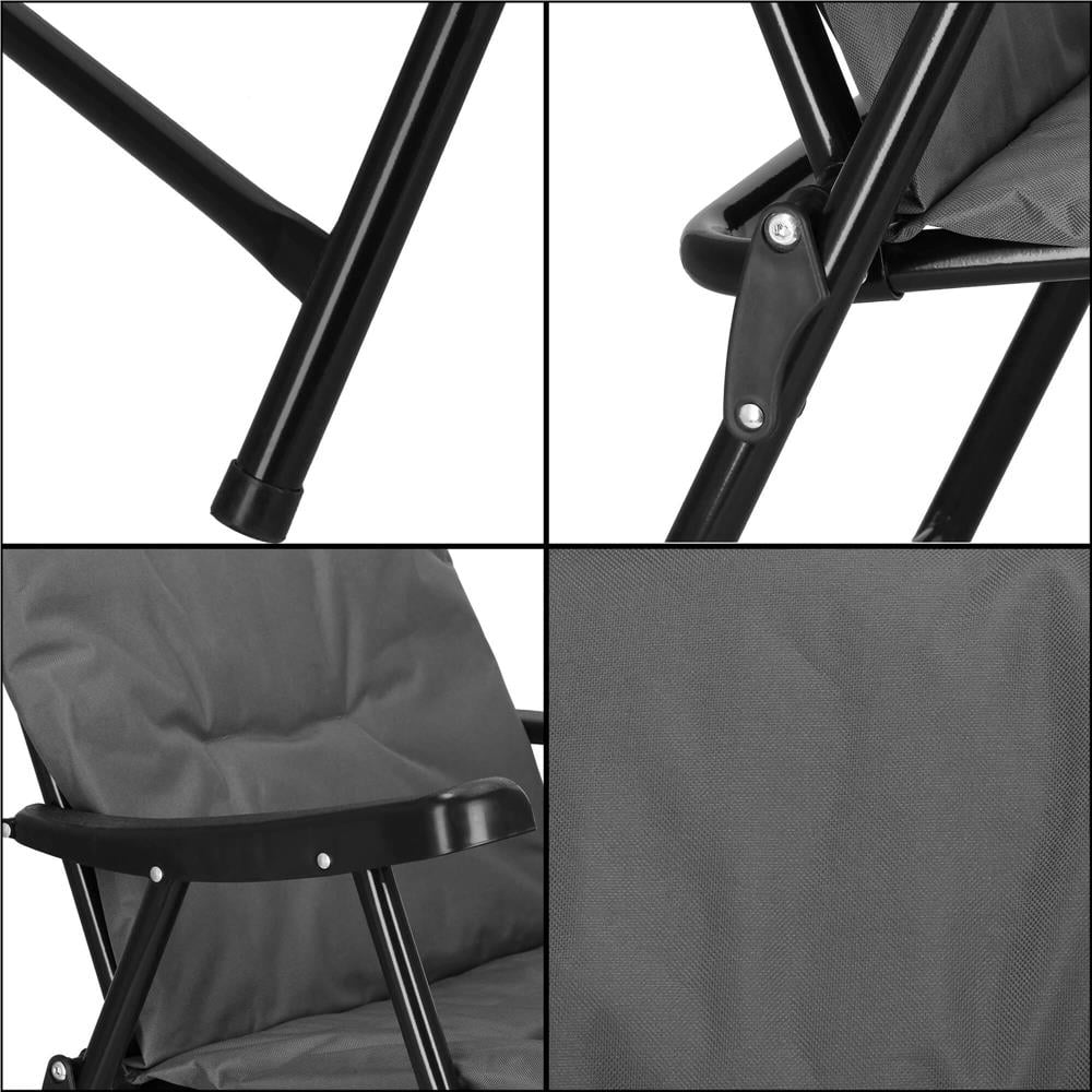 Culoare: gri Material: metal (constructie); 100% poliester; plastic (cotiere) Scaun si spatar cu umplutura moale Pliabil: da Incarcare maxima: 120 kg Dimensiuni: Inaltime totala: 91 cm Latimea totala: 58 cm Adancime totala: 68 cm Deoarece este destinat utilizarii in aer liber, scaunul este fabricat dintr-o tesatura sintetica rezistenta. Aceasta este durabila si mai rezistenta la intemperii si deteriorari - mai mult decat fibrele naturale. In acelasi timp, se adapteaza perfect la corp si ofera un nivel ridicat de confort pentru utilizatori.Sarcina maxima a sezlongului este de pana la 100 kg. Constructia scaunului pliabil este realizata din metal acoperit cu pulbere, cu atentie la cele mai mici detalii, ceea ce sporeste semnificativ rezistenta acestuia la conditiile meteorologice. Scaunul pliabil este echipat cu cotiere, care vor asigura o pozitie de sedere confortabila. Puteti plia rapid si usor scaunul de camping si il puteti muta cu usurinta datorita constructiei sale usoare . Functia de pliere va permite sa luati mai multe scaune cu dvs. - se potrivesc cu usurinta in portbagaj si, ceea ce este la fel de important, depozitarea lor in afara sezonului necesita mult spatiu.