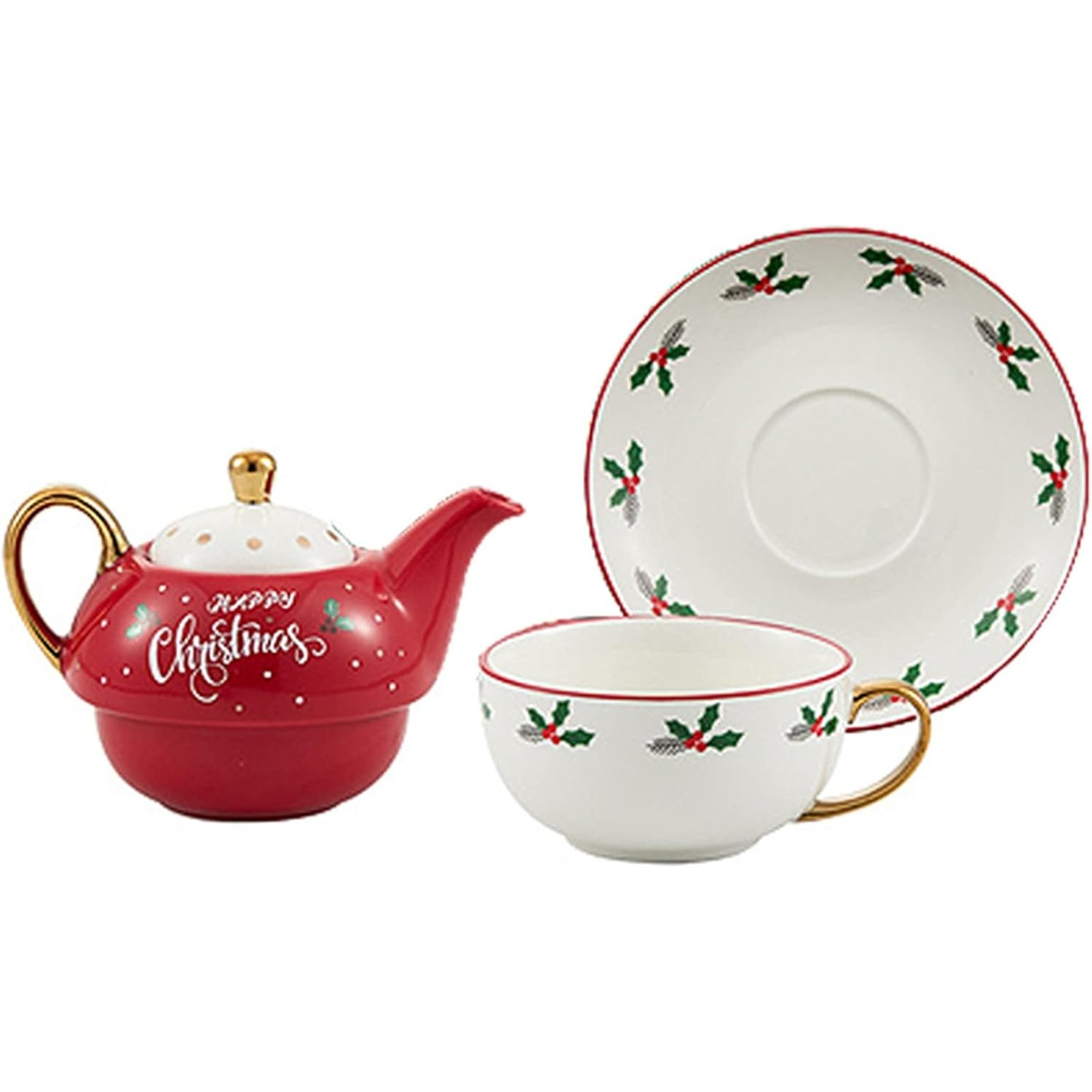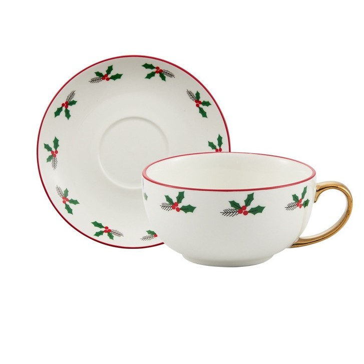 Ceainicul este gândit să se așeze perfect peste cană, economisind spațiu, iar farfuria completează setul pentru o experiență rafinată de servire a ceaiului. Designul festiv aduce o notă veselă și este ideal atât pentru uz personal, cât și pentru a fi oferit cadou de Crăciun sau alte ocazii speciale.