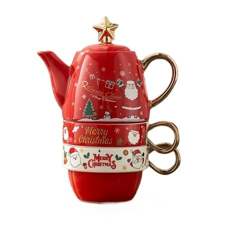 Set de Ceai, , Temă Crăciun, Ceainic 450 ml, 2 Căni 250 ml, Model Mos Craciun, Roșu