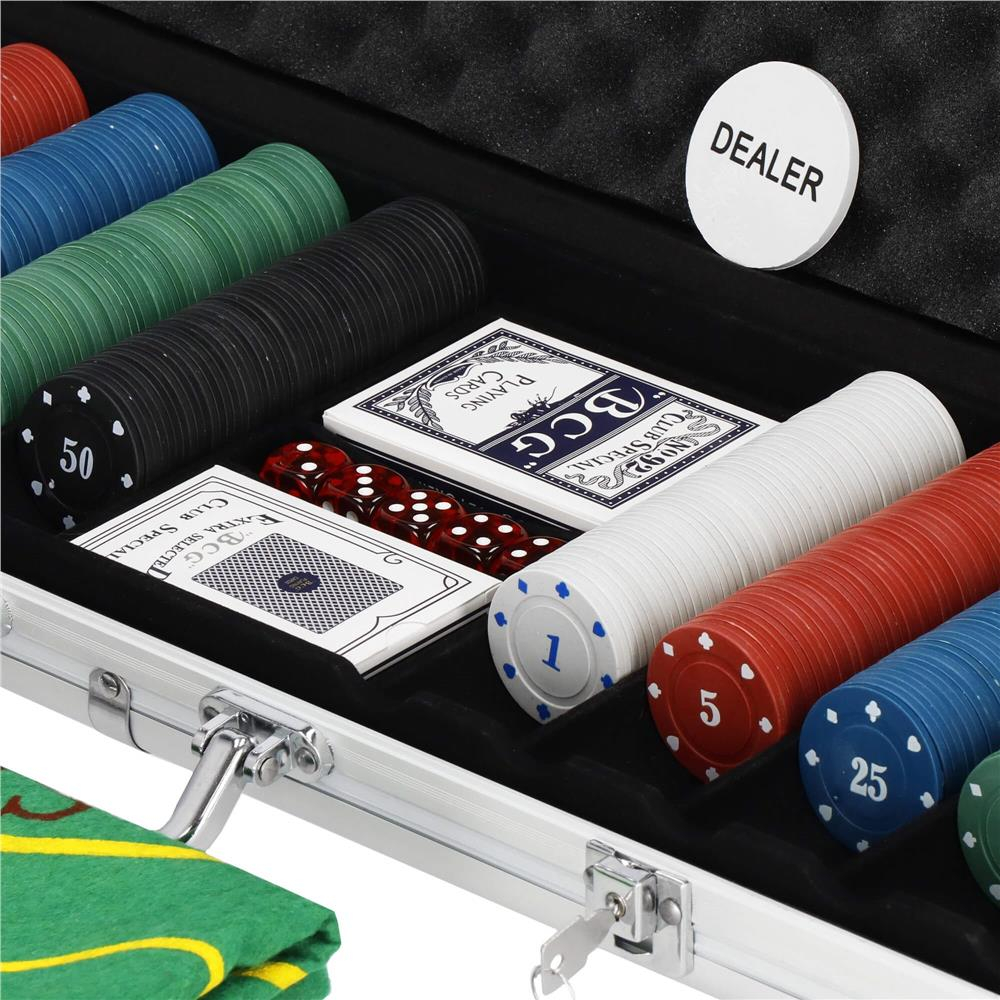 Set de Poker Complex cu 500 de jetoane, covoras verde, 2 seturi de carti, 5 zaruri, in servieta aluminiu