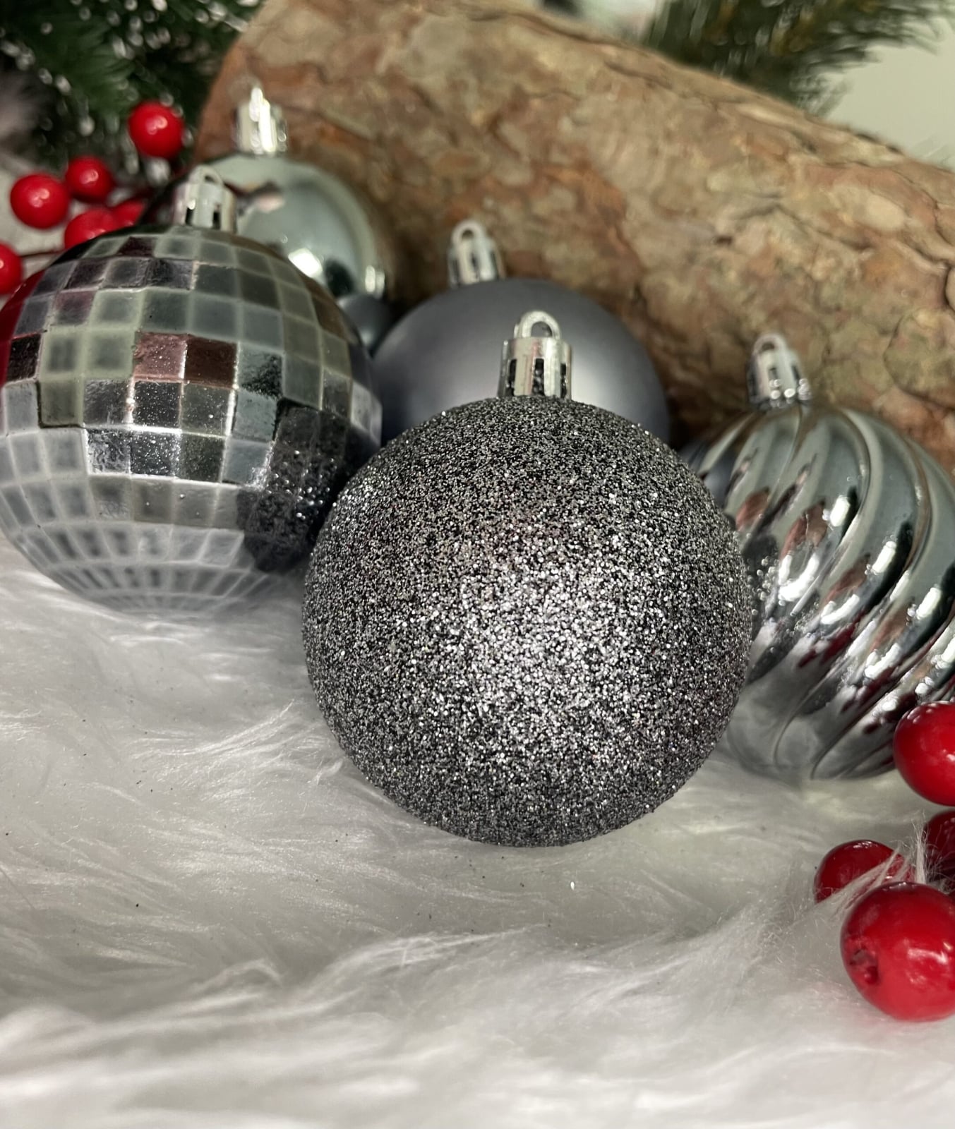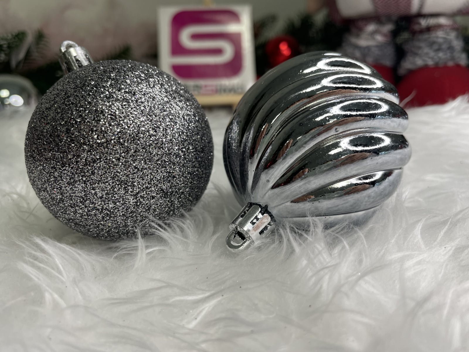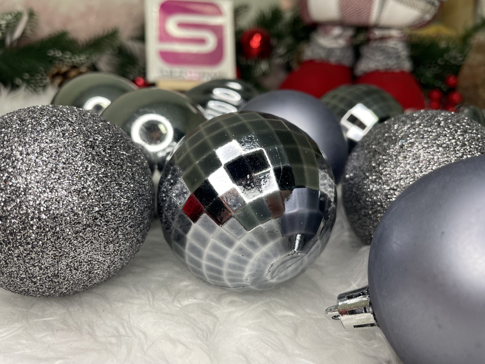 Culoare: argintiu Material: plastic Cantitate: 20 de globulete Modele: mat, cu sclipici, in relief si bile disco Incasabil, snur pentru agatat Craciunul, ca si intreaga...