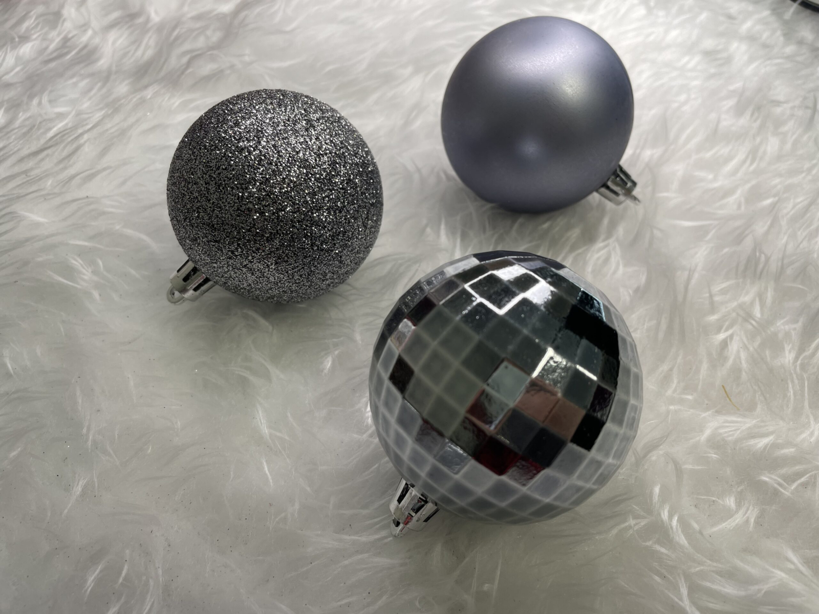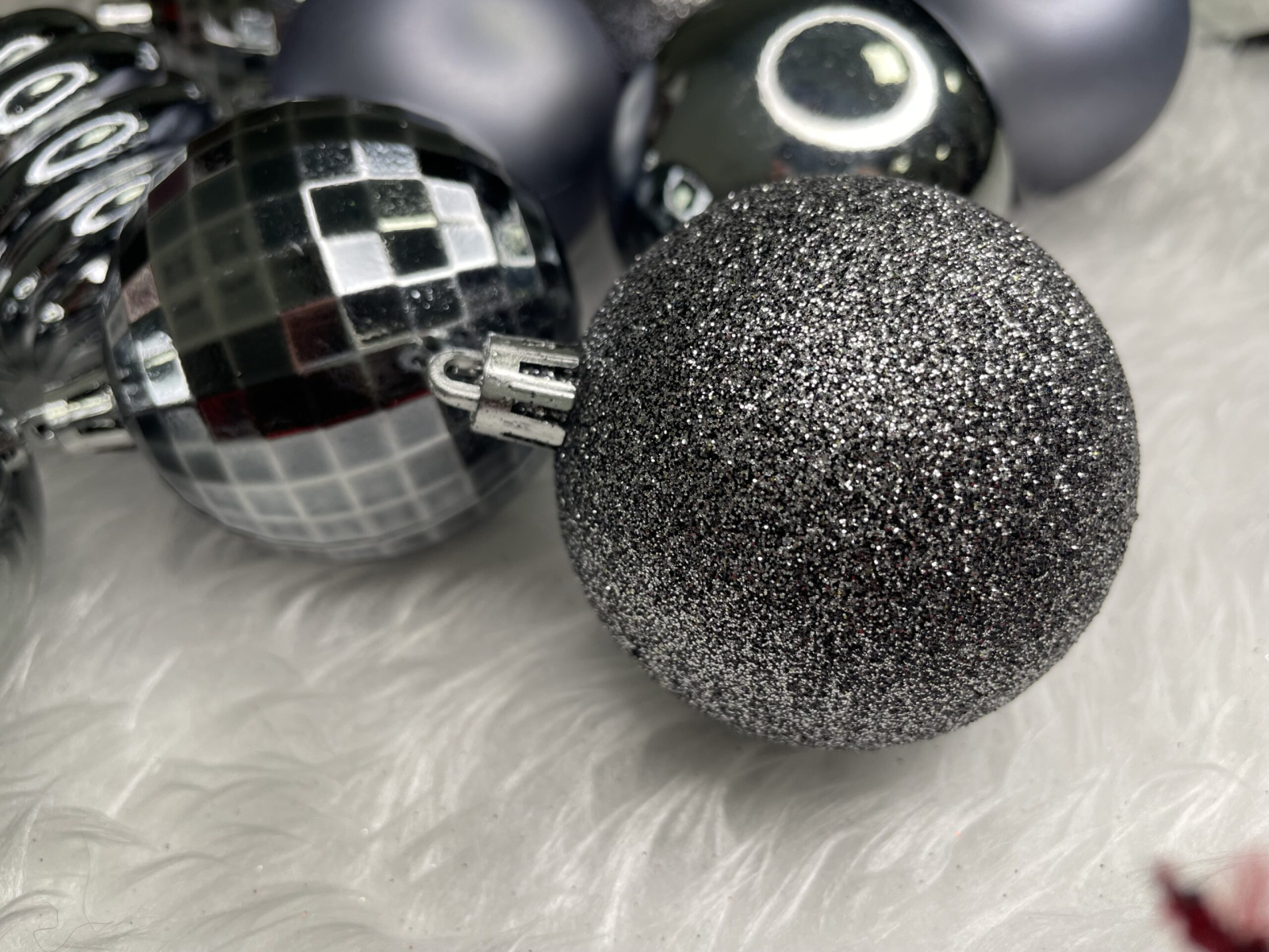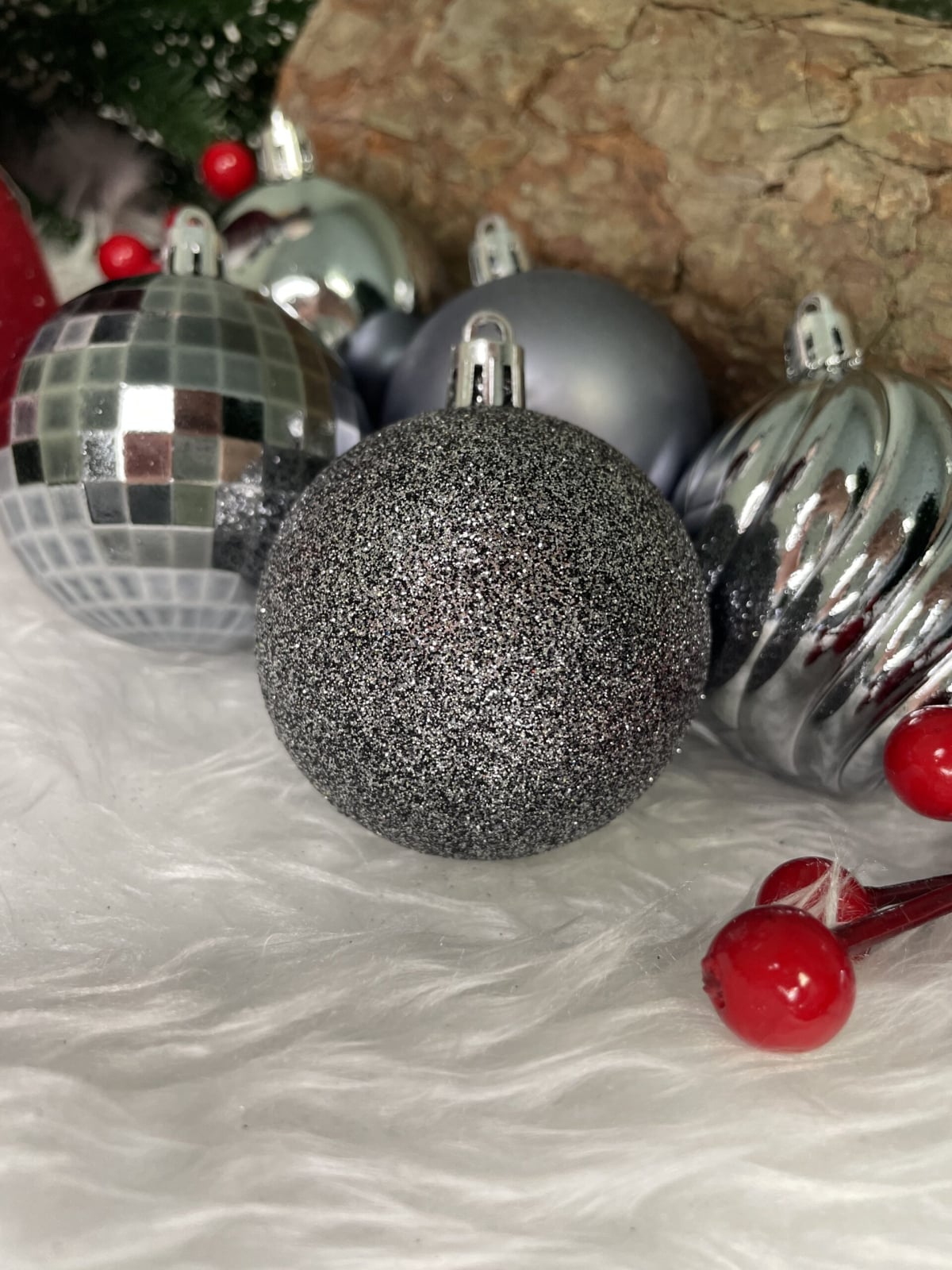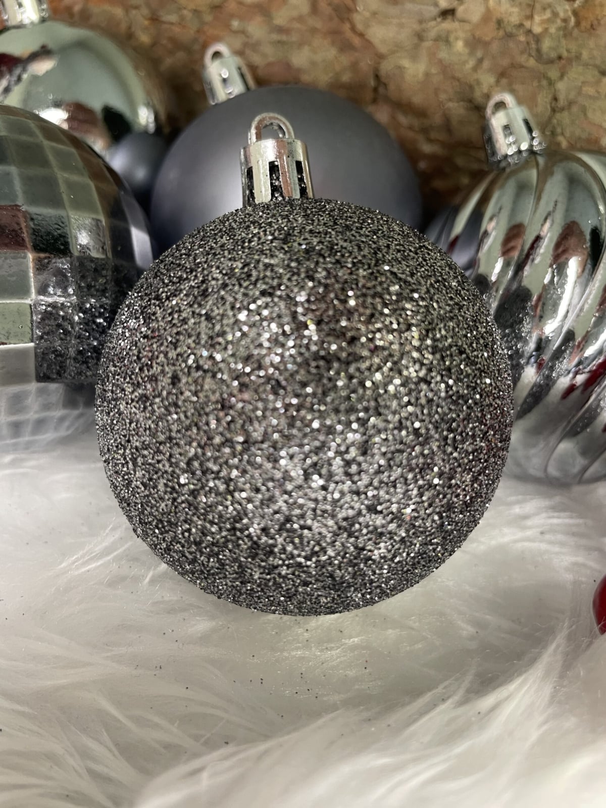 Culoare: argintiu Material: plastic Cantitate: 20 de globulete Modele: mat, cu sclipici, in relief si bile disco Incasabil, snur pentru agatat Craciunul, ca si intreaga...