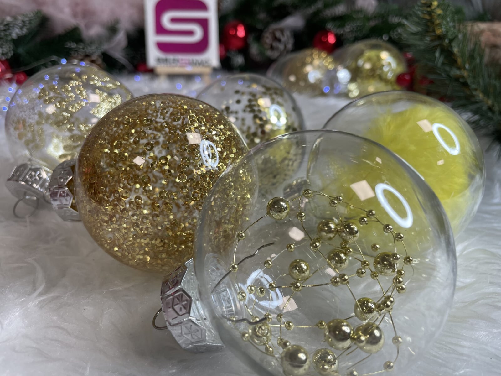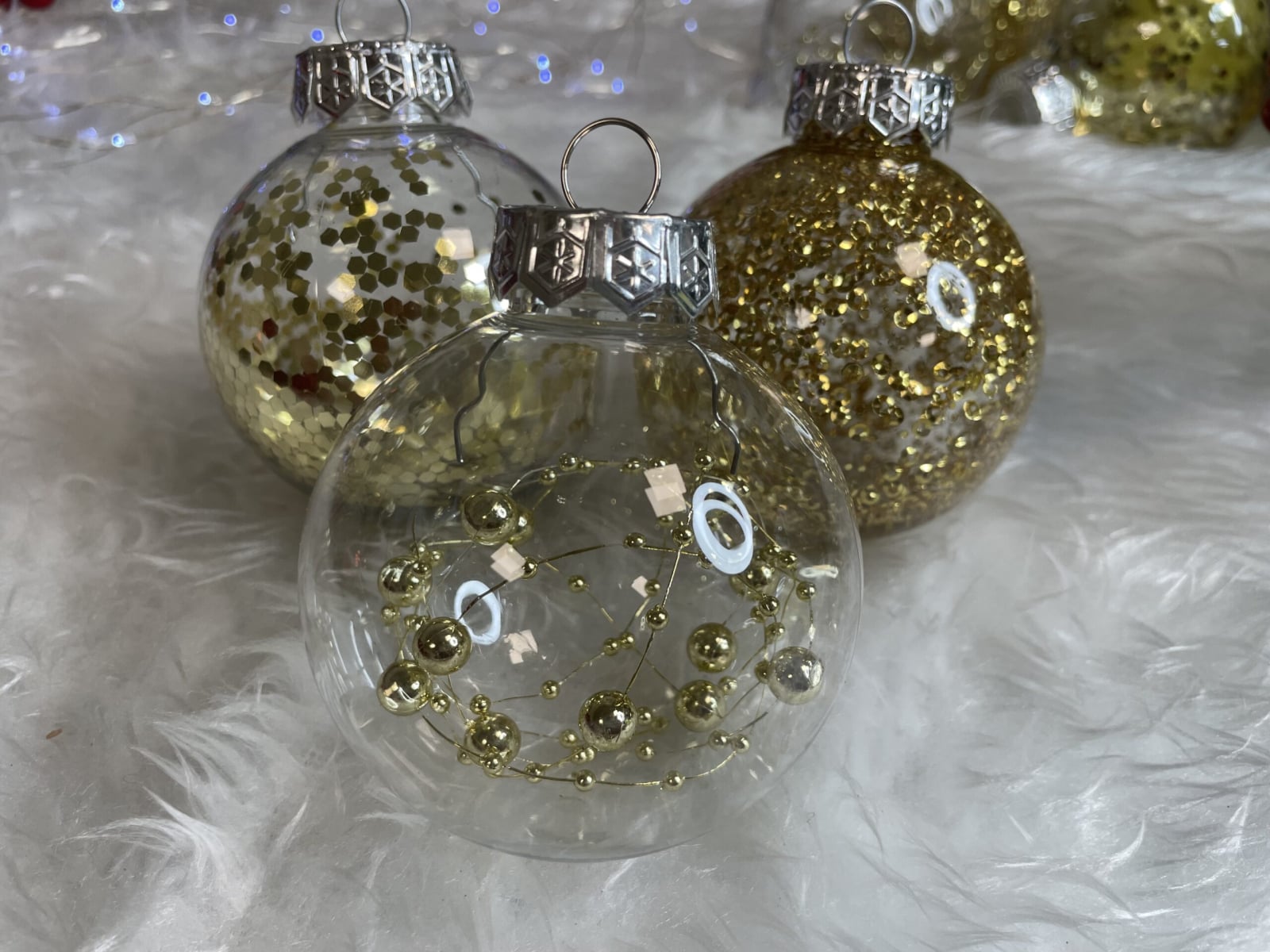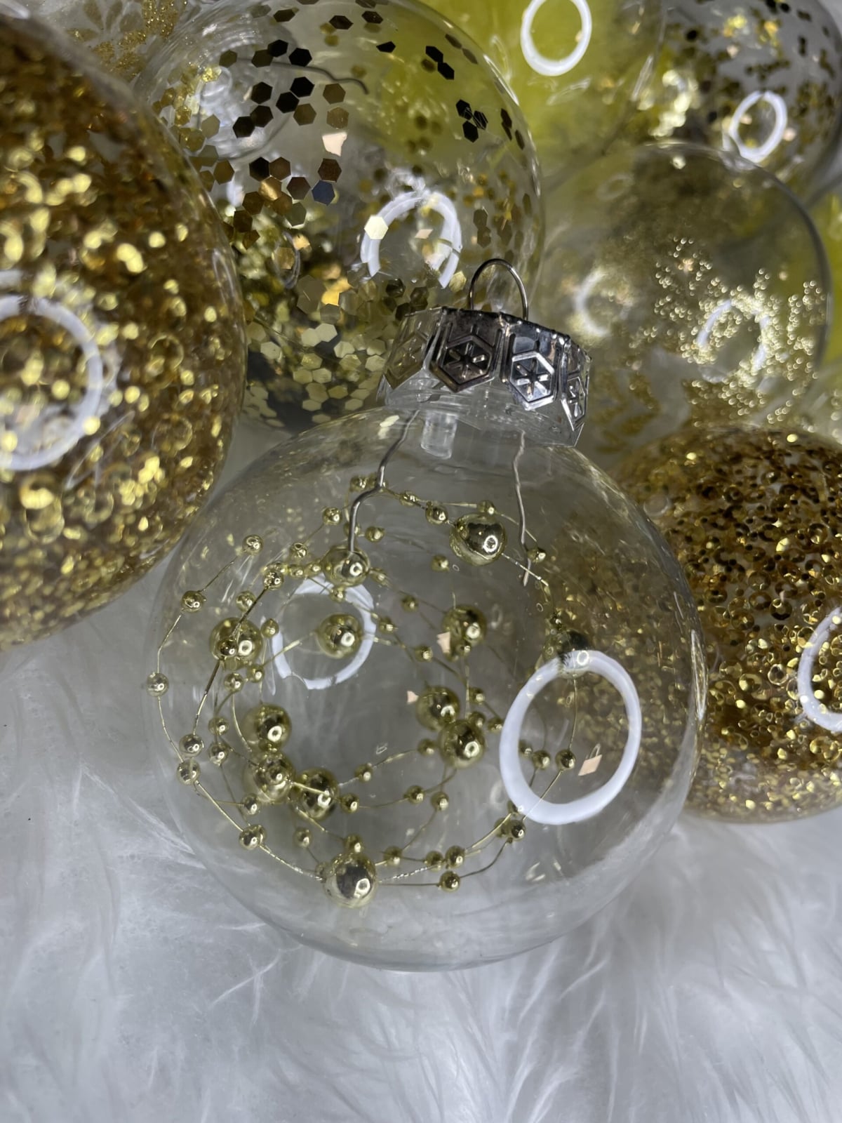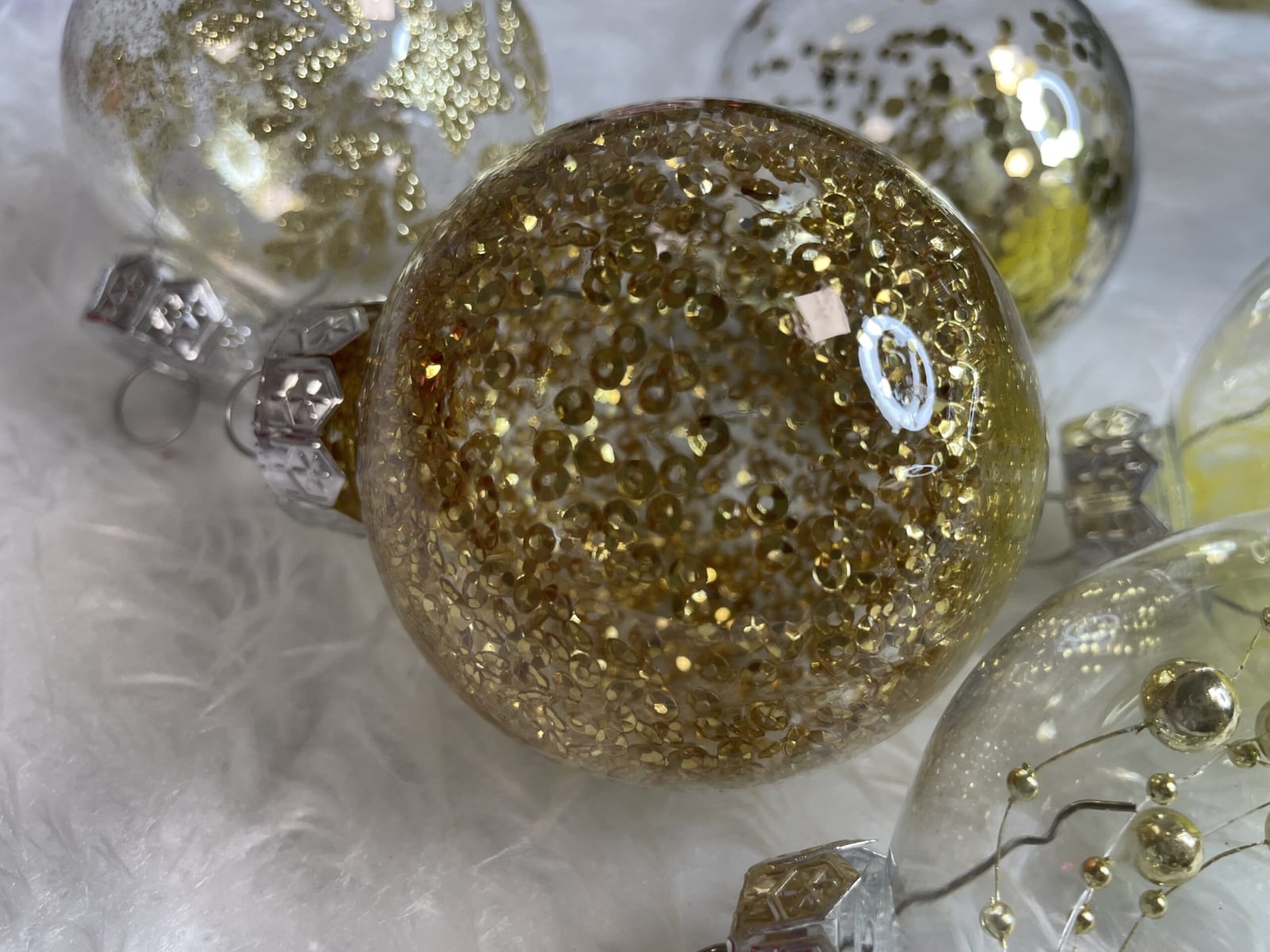 Set globuri de Craciun Inedit, 30 bucati, 7cm, transparente si auriu