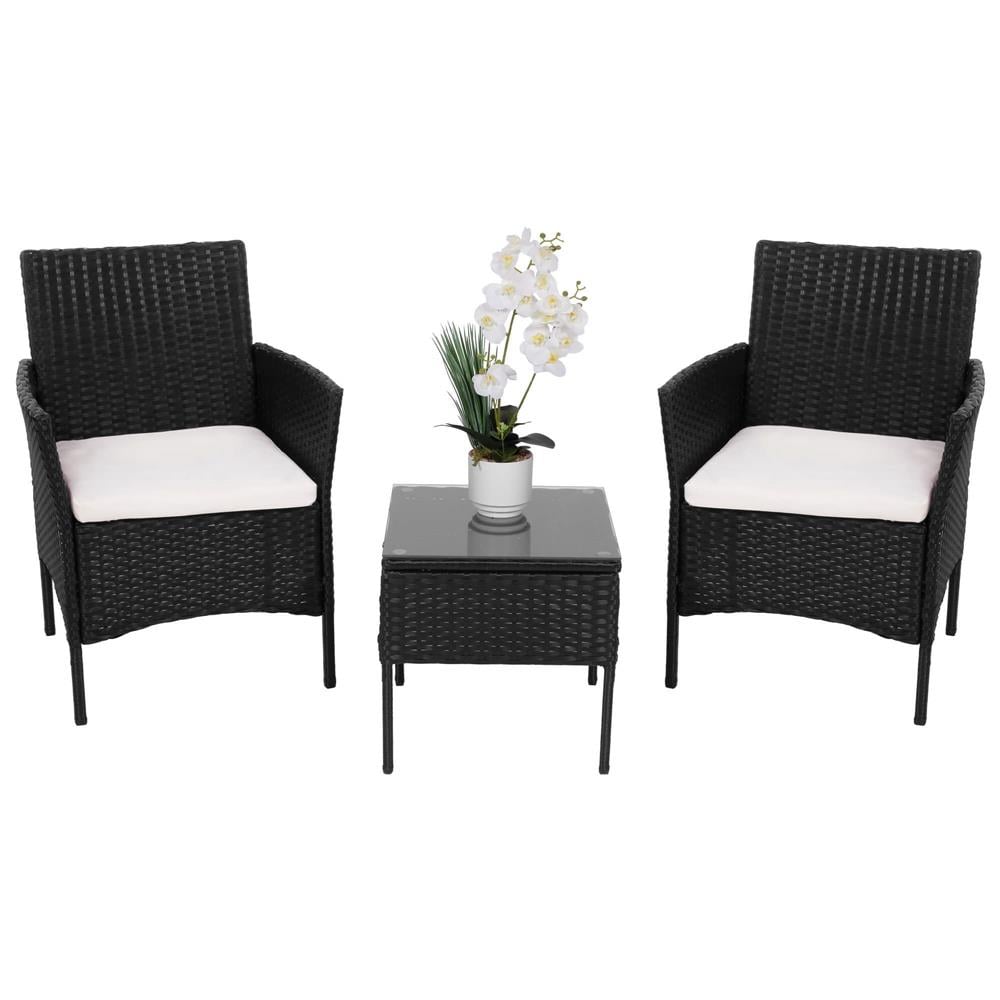Set mobilier terasa, din tehnorattan, masa cu blat sticla securizata, 2 fotolii cu perne, negru