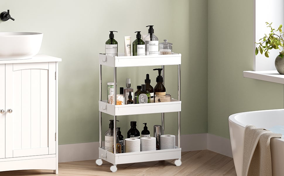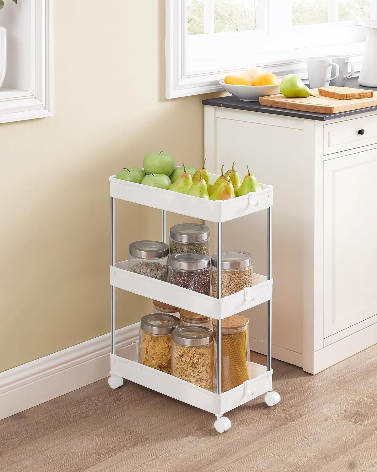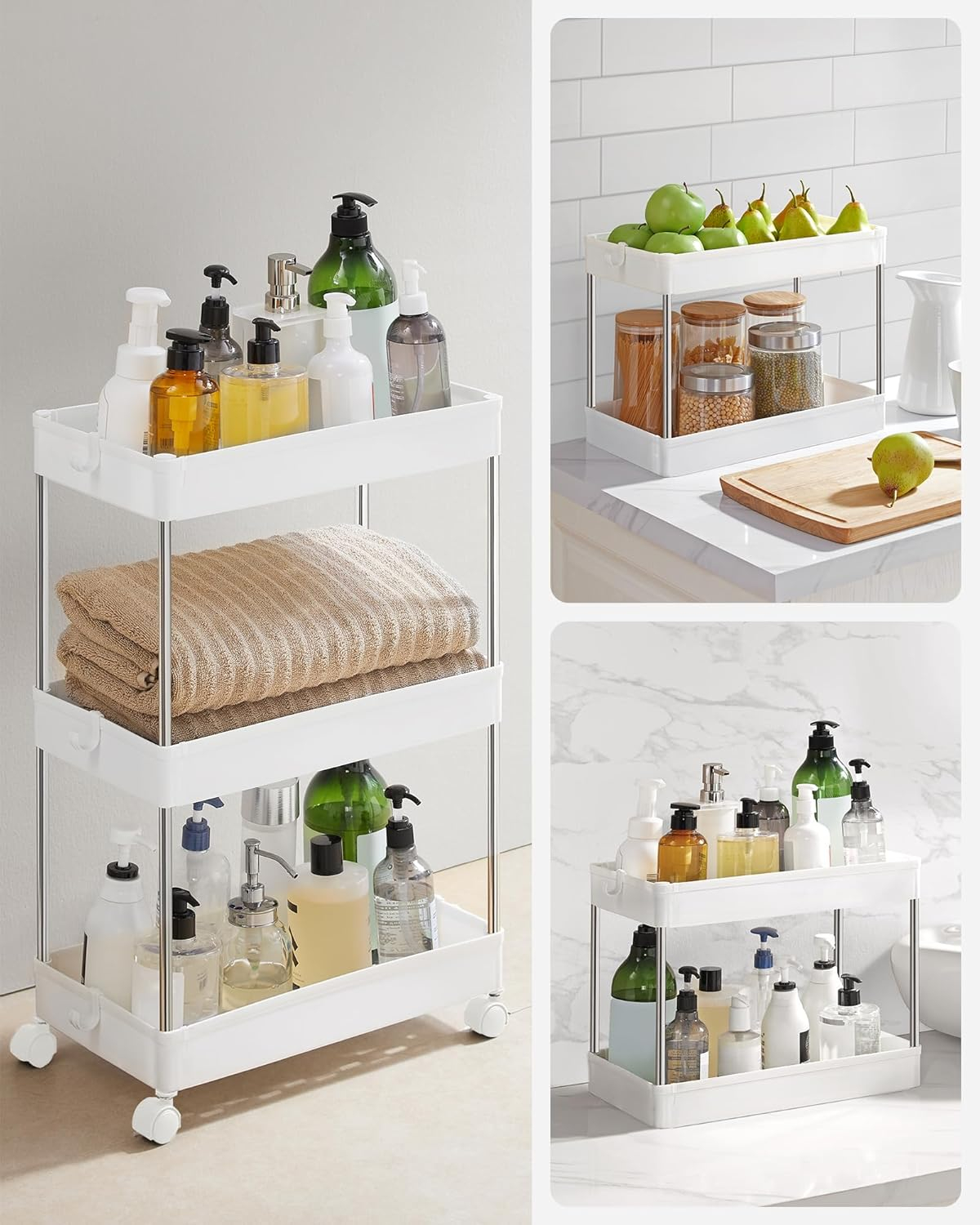 SONGMICS Carucior cu 3 niveluri, rafturi etajate detasabile, roti pivotante 360°, cadru metalic, 42x24x61 cm, alb