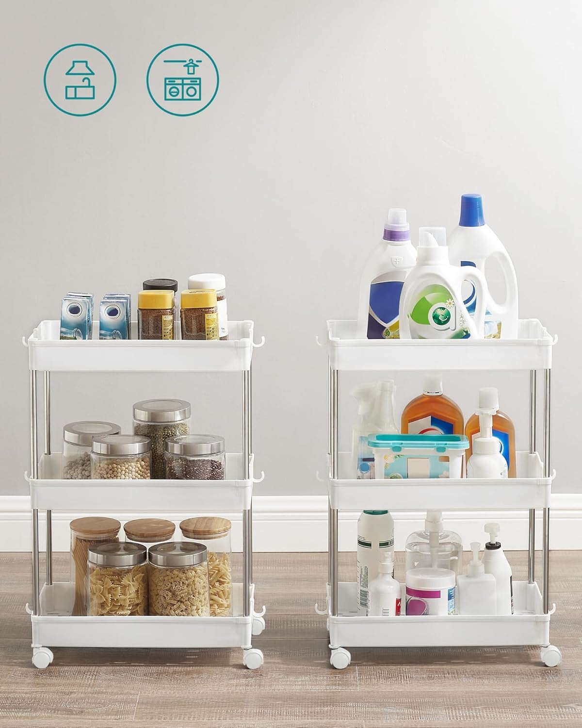 Specificatii tehnice Brand: SONGMICS Model: KSC009W01 Tip produs: Carucior bucatarie slim Material: PP (polipropilena), tuburi metalice Culoare: Alb Dimensiuni: 42 x 24 x 61 cm Numar niveluri: 3 Capacitate maxima: 15 kg Accesorii incluse: 6 carlige detasabile Mobilitate: 4 roti pivotante 360° Scurta descriere Caruciorul de bucatarie SONGMICS cu 3 niveluri este solutia ideala pentru spatii mici, oferind rafturi etajate incapatoare, carlige reglabile si roti pivotante pentru o mobilitate usoara. Designul slim permite integrarea in bucatarii, bai sau birouri fara a ocupa spatiu inutil. Caracteristici principale Design slim pentru spatii mici Rafturi etajate pentru organizare eficienta 6 carlige detasabile pentru accesorii Cadru metalic rezistent Roti pivotante 360° pentru manevrare usoara Capacitate de sustinere pana la 15 kg Montaj rapid si simplu