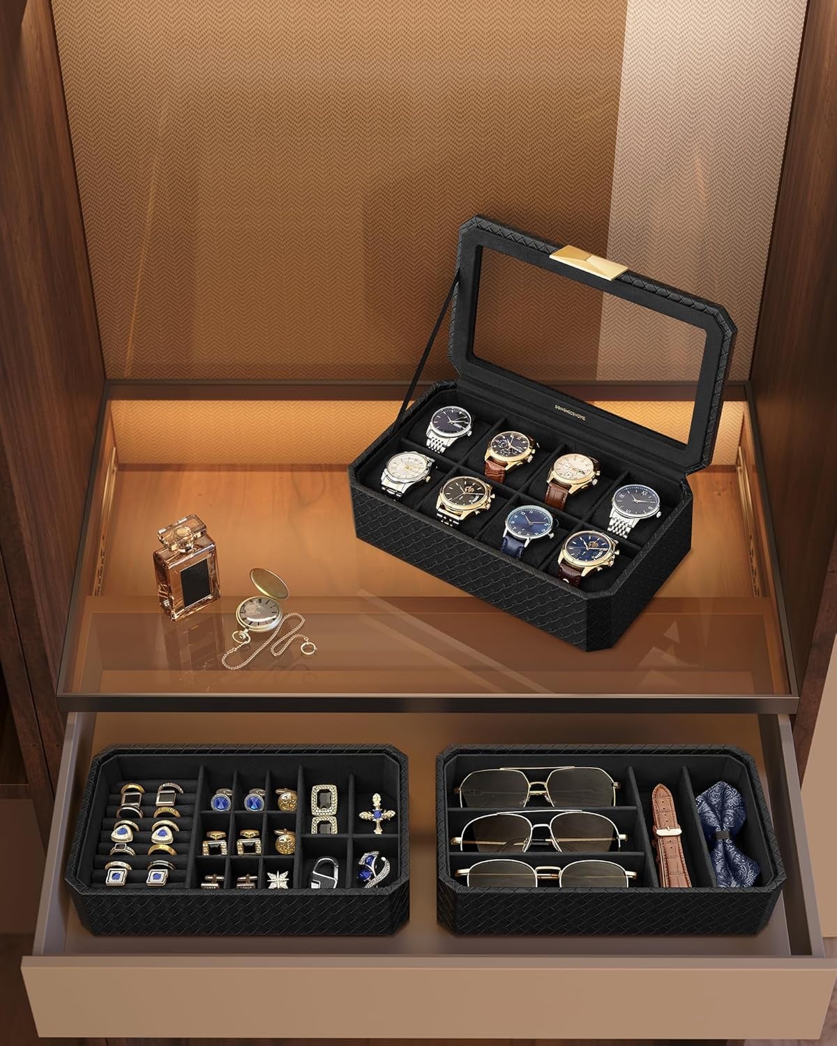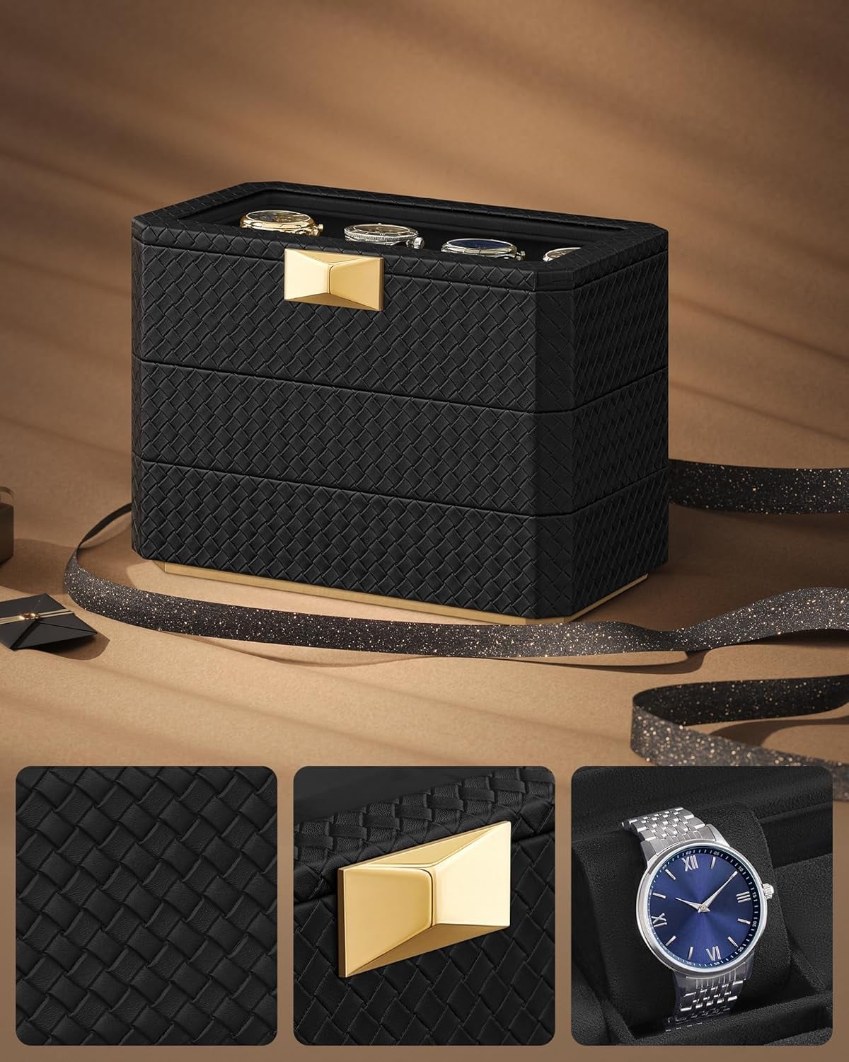 Specificatii tehnice Brand: SONGMICS Tip produs: Cutie pentru ceasuri si accesorii Material: PU cu aspect impletit, piele intoarsa sintetica, sticla, metal Culoare: Negru cerneala (exterior...