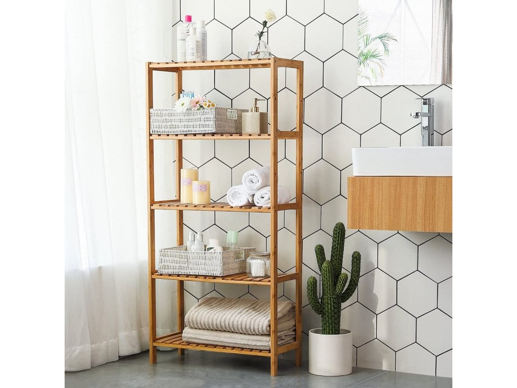 Numar de rafturi: 5 Caracteristica speciala: Reglabil Dimensiunile produsului: 26D x 130W x 60H centimetri Un suport din bambus de care sa te indragostesti: Datorita rafurilor reglabile, tot ce folosesti des in viata de zi cu zi poate fi depozitat ingrijit intr-un singur loc. Acest raft ofera, de asemenea, casei tale o nota moderna si calda.Adaptabil la nevoile dvs.: diferite obiecte, fie ele mici sau mari, pot fi depozitate cu usurinta in acest suport pe picioare, deoarece cele 5 niveluri de rafturi pot fi reglate la 9 inaltimi diferite.Beneficiile bambusului: Acest suport din bambus are mai mult de oferit decat aspectul sau fermecator. Ca materie prima regenerabila, bambusul este adesea folosit ca material pentru mobilier; o alegere perfecta pentru o casa „verde”! (fiecare raft poate sustine pana la 10 kg)Asamblare usoara: Nu trebuie sa fii un expert pentru a configura aceasta polita de baie, deoarece ramele sale laterale constau dintr-o singura piesa odata. Pur si simplu conectati rafturile la ramele laterale si acest raft este configurat.