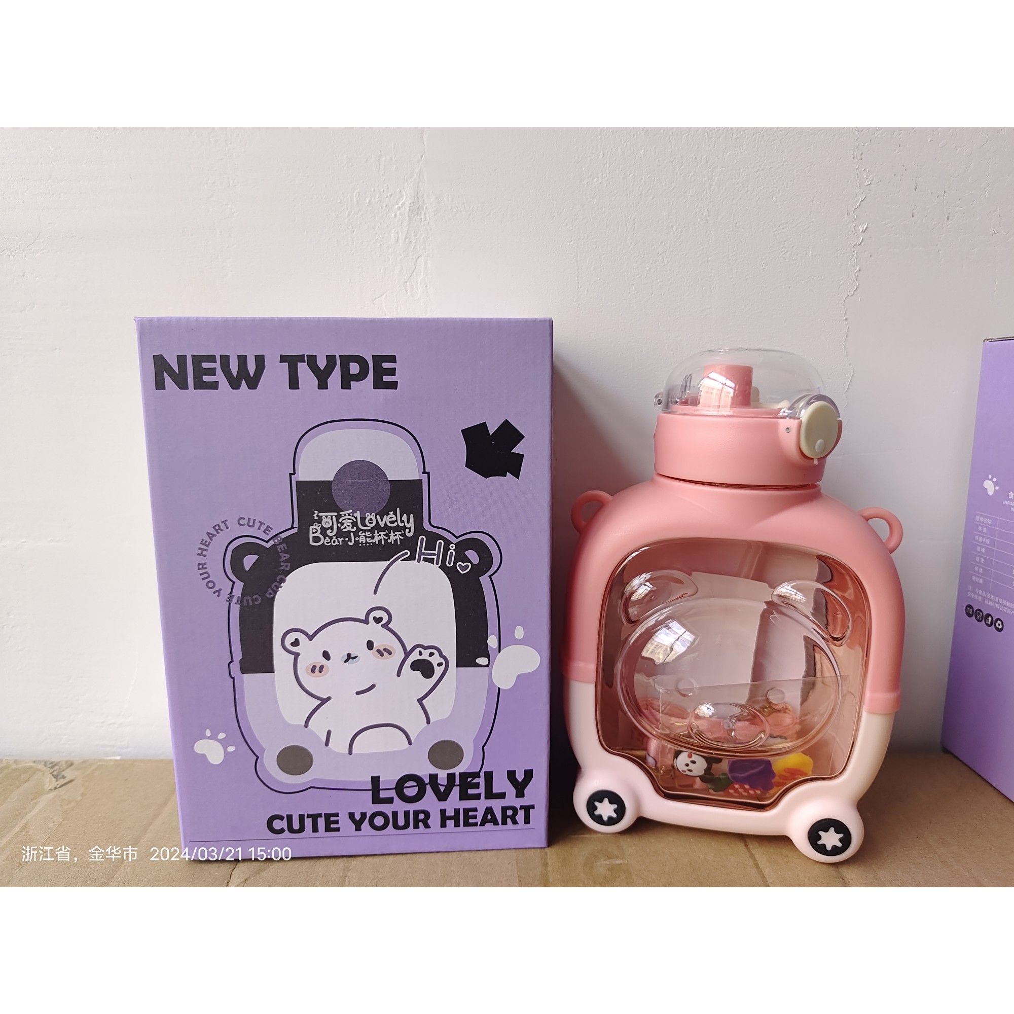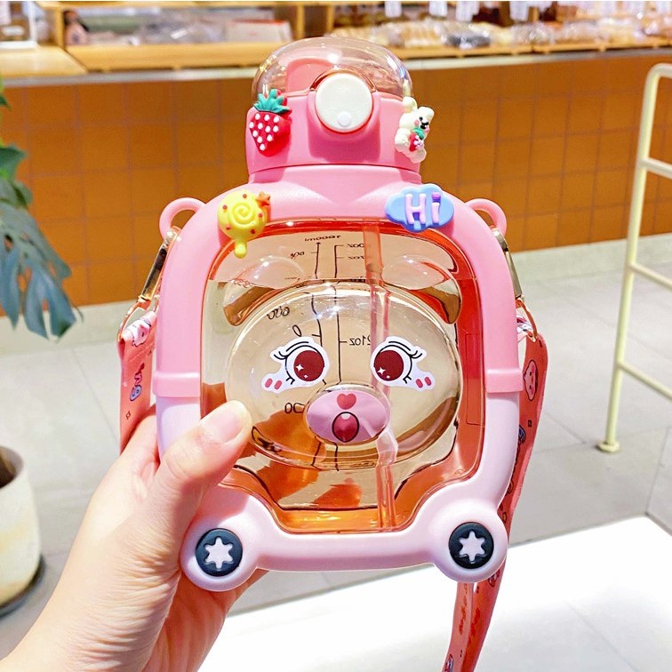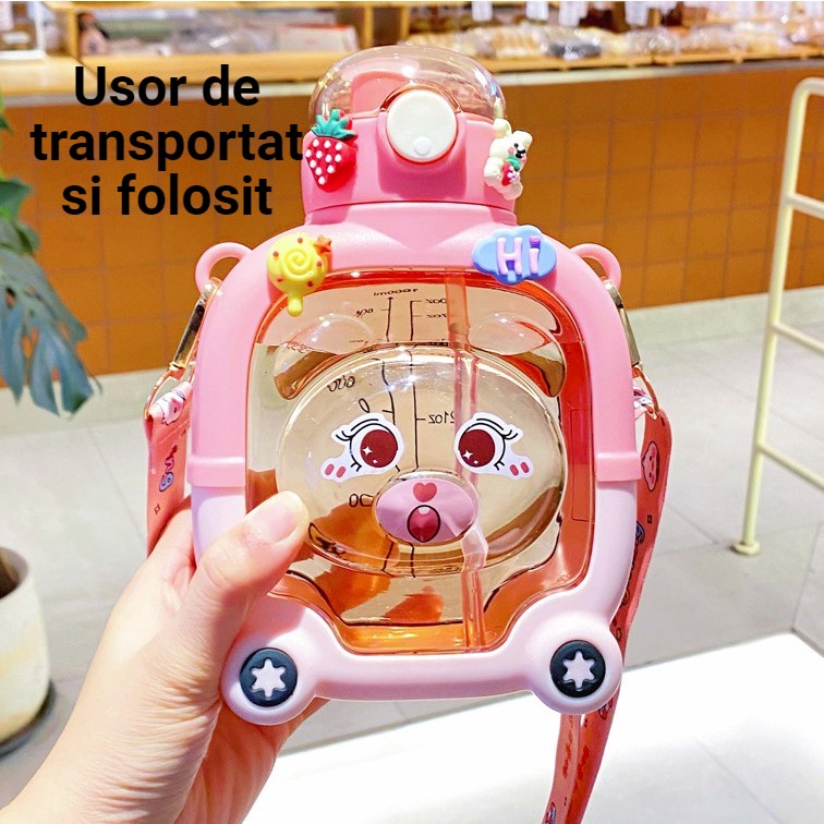 Sticla cu pai pentru copii, , model ursulet, gradata, stickere aplicate, curea reglabila, din plastic rezistent la cadere, 1l, Roz, 20 x 13 cm