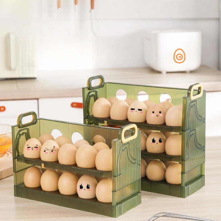 Descriere produs: Suport organizator pentru ouă pentru frigider - Verde transparent, capacitate 30 ouă, trei straturi