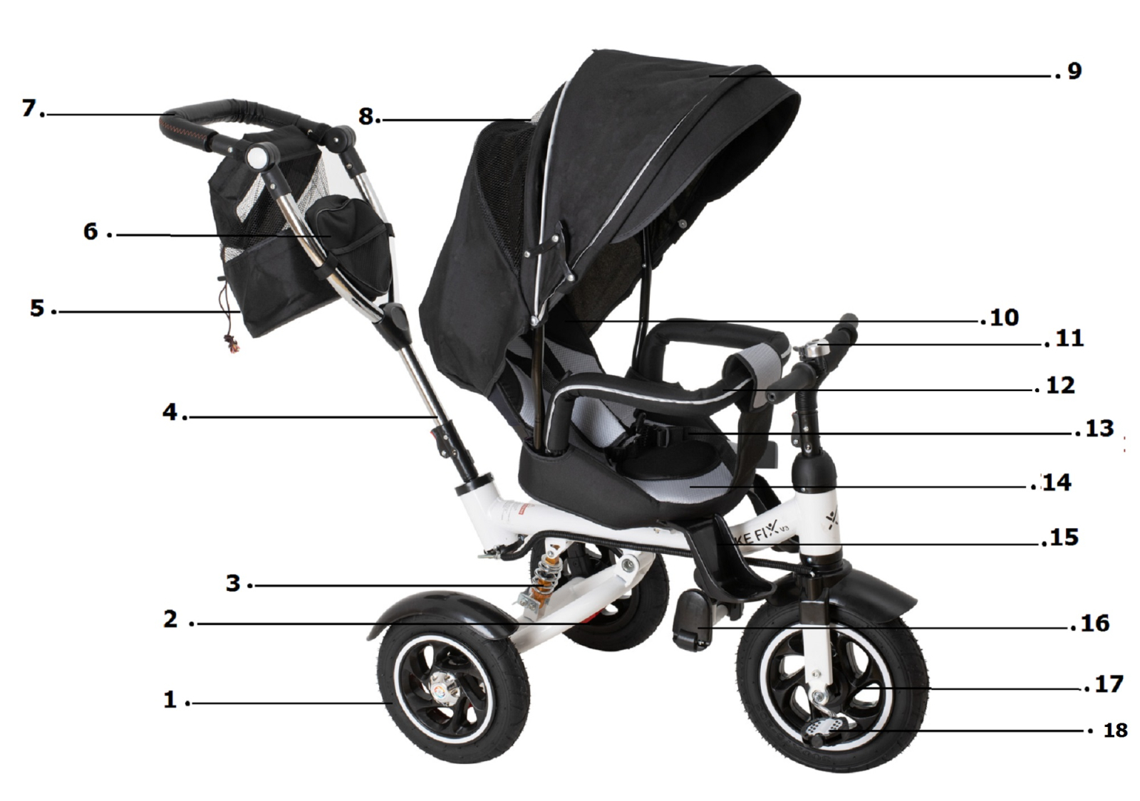 Specificatii tehnice: Tip produs: Tricicleta 3in1 evolutiva pentru copii Culoare: Negru Varsta recomandata: 1 – 6 ani Greutate produs: 13 kg Greutate maxima suportata: 30 kg Material roti: EVA, fara aer Material cadru: Metal Latime sezut: 29 cm Inaltime sezut de la sol: 46 cm Inaltime spatar: 30 cm Latime ghidon: 41 cm Inaltime ghidon: 68 cm Latime copertina extinsa: 37 cm Diametru roti: 28 cm Lungime cadru (pana la ghidon): 51 cm Inaltime maner parental: 70 – 110 cm Accesorii incluse: Cos, gentuta, dzwon, suport picioare Scurta descriere: Tricicleta TRIKE FIX V3 este un vehicul evolutiv 3in1 care creste odata cu copilul tau. Ofera confort si siguranta de la 1 an pana la 6 ani, fiind echipata cu sezut rotativ 360°, copertina reglabila, roti EVA fara intretinere si ghidon parental ajustabil. Designul modern si culoarea eleganta o fac o alegere ideala pentru plimbari zilnice, excursii si cadou memorabil. Caracteristici principale: Functie 3in1 – tricicleta pentru bebelusi, mod intermediar si tricicleta independenta Sezut rotativ 360° cu tapiterie moale si detasabila Spatar reglabil pentru pozitie confortabila Copertina cu protectie solara si plasa de ventilatie Roti EVA rezistente, fara camere Sistem „roata libera” pentru control parental complet Pasi de siguranta si pedale antiderapante Ghidon parental reglabil Cos pentru cumparaturi si geanta pentru accesorii incluse Manere din cauciuc si cadru stabil, usor de pliat Ideal pentru dezvoltarea echilibrului si coordonarii