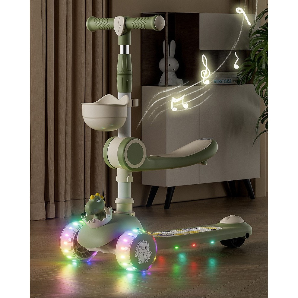 Trotineta Multifunctionala 3 in 1, , pentru Copii, 1-7 Ani, cu Lumini si Muzica, Reglabil 360, Pliere Usoara, Reglarea Inaltimii, Model Dinozaur, Bej/Verde