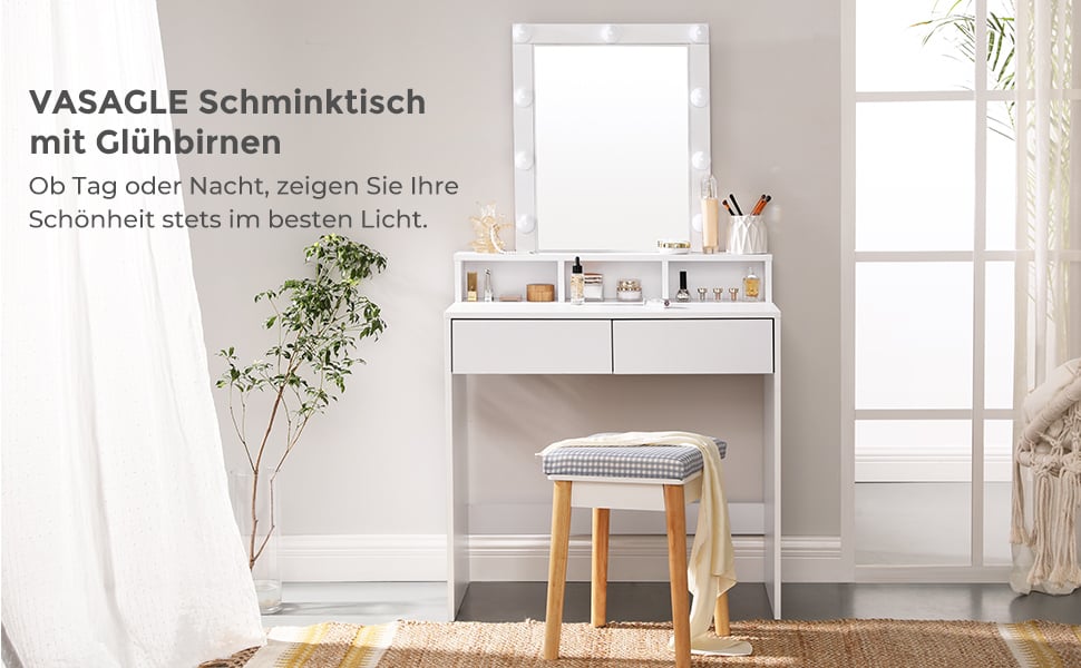 Atentie! Nu sunt incluse taburetul si alte decoratiuni  Culoare: alba Dimensiuni: 40 x 80 x 145 cm Dimensiunile produsului: 40D x 80W x 145H cm Marca: VASAGLE Despre acest articol Fara cusur. Spuneti adio machiajului estompat care va strica intregul look. Cele 9 becuri reglabile care inconjoara oglinda iti lumineaza zona de infrumusetare si fac posibil un eyeliner perfect.Totul acolo: Te-ai saturat sa iti cauti machiajul in fiecare zi? Nicio problema. Fardurile de ochi si pudra se afla acum in cele doua sertare mari, lacul de unghii este bine protejat in cele 3 compartimente deschise, iar sticlutele de parfum pot fi asezate pe raftul inaltat.Incepeti ziua cu bucurie: designul modern si culoarea deschisa a acestei masute cosmetice va vor pune mereu un zambet pe fata. Folositi bijuteria pentru a incerca cele mai noi trucuri de machiaj.Intotdeauna in forma: daca dupa ce v-ati aplicat machiajul sunteti socata sa constatati ca exista pete de machiaj pe aceasta masa de toaleta, va putem linisti. Aceasta are un strat de melamina care este usor de curatat.Continut: o masuta de toaleta cu becuri, elemente numerotate si instructiuni usor de urmat (limba engleza nu este garantata). Veti primi, de asemenea, un dispozitiv anti-inclinare si o ocazie excelenta de a va relaxa si de a va pregati.