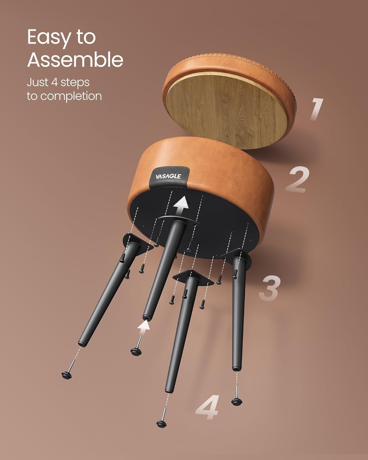 Specificatii: Culoare: maroMateriale:Otel, spuma de inalta rezilienta 25D, PU (poliuretan), placajDimensiuni: 38,2 x 44,4 cm (⌀ x H)Diametrul scaunului: 32 cmGreutate: 3,3 kgCapacitate maxima de incarcare statica: 150 kg Continutul pachetului: 1 x taburet de depozitare1 x Kit de montare1 x Instructiuni de utilizare Farmec si versatilitate Aceasta piesa de mobilier poate fi folosita ca taburet pentru masuta de toaleta, ca suport de picioare pentru fotoliu sau pur si simplu ca masuta laterala prin intoarcerea partii superioare. Cu un volum de 9,4L, este perfecta pentru depozitarea obiectelor dvs. mici. Imbogateste-ti spatiul Bucura-te de aceasta combinatie de PU, cusaturi rafinate si picioare conice ale acestui otoman de depozitare din colectia VASAGLE EKHO, un omagiu concret adus spiritului artizanal, care iti inalta locuinta pe noi culmi de eleganta. Facut pentru a rezista Acest taburet de toaleta are 4 picioare din otel robust si este ranforsat cu un strat de perete gros de 1,2 mm. Acest taburet de depozitare ofera un sezut comfortabil care rezista in timp, fara a-si pierde forma. Usor de asamblat si de curatat Instalarea este o joaca de copii: pur si simplu fixati picioarele si fiti gata sa faceti senzatie cu noul dvs. taburet. In plus, suprafata sa din piele ecologica de calitate il face usor de curatat si ramane impecabila cu un efort minim.