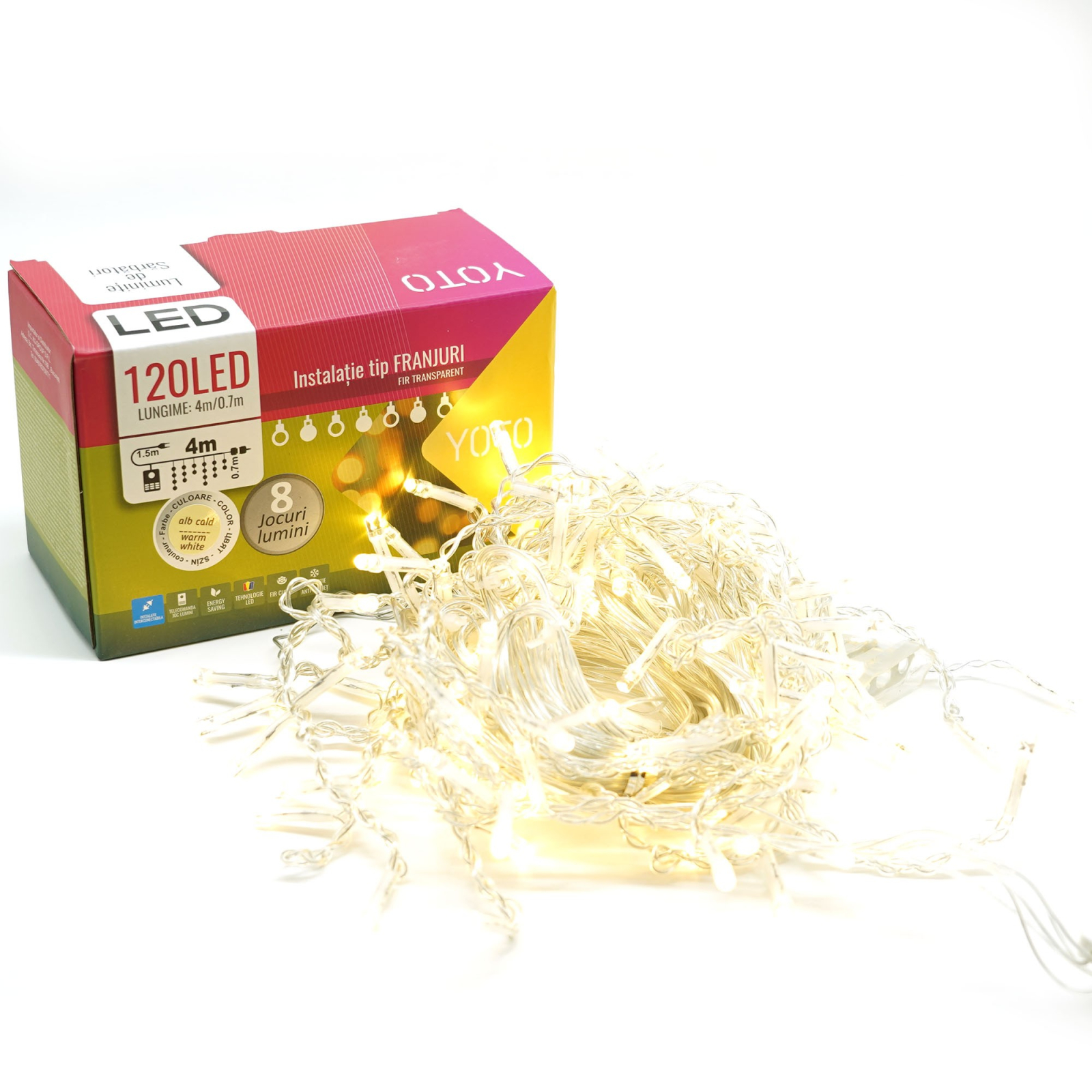 Instalatie Craciun Yoto, Tip Franjuri/Turturi, 4 m, 120 LED-uri, Prelungitor 1.5 m, 8 Jocuri de Lumini, Interconectabila, Conectare la Retea, Fir transparent, Interior/Exterior, Alb Cald