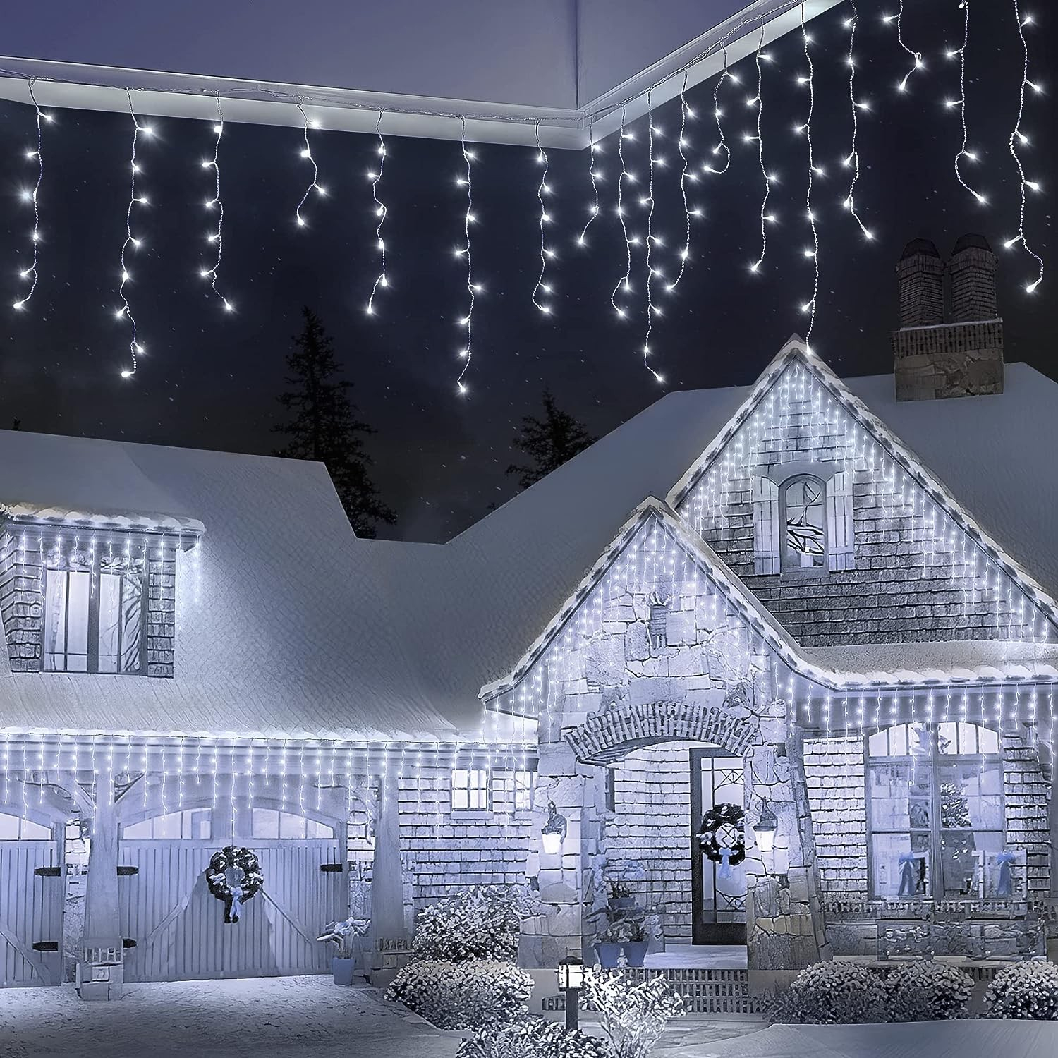 Instalatie Craciun Yoto, Tip Franjuri/Turturi, 4 m, 120 LED-uri, Prelungitor 1.5 m, 8 Jocuri de Lumini, Interconectabila, Conectare la Retea, Fir transparent, Interior/Exterior, Alb Rece