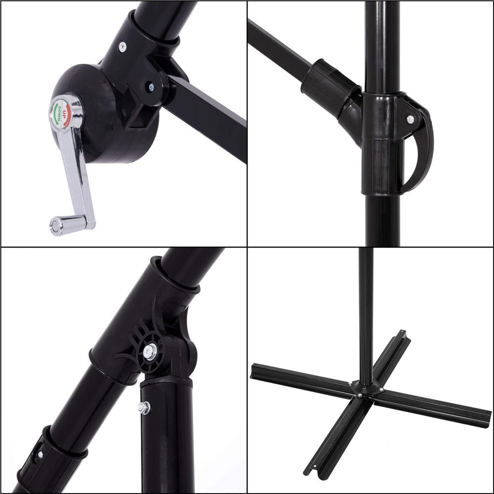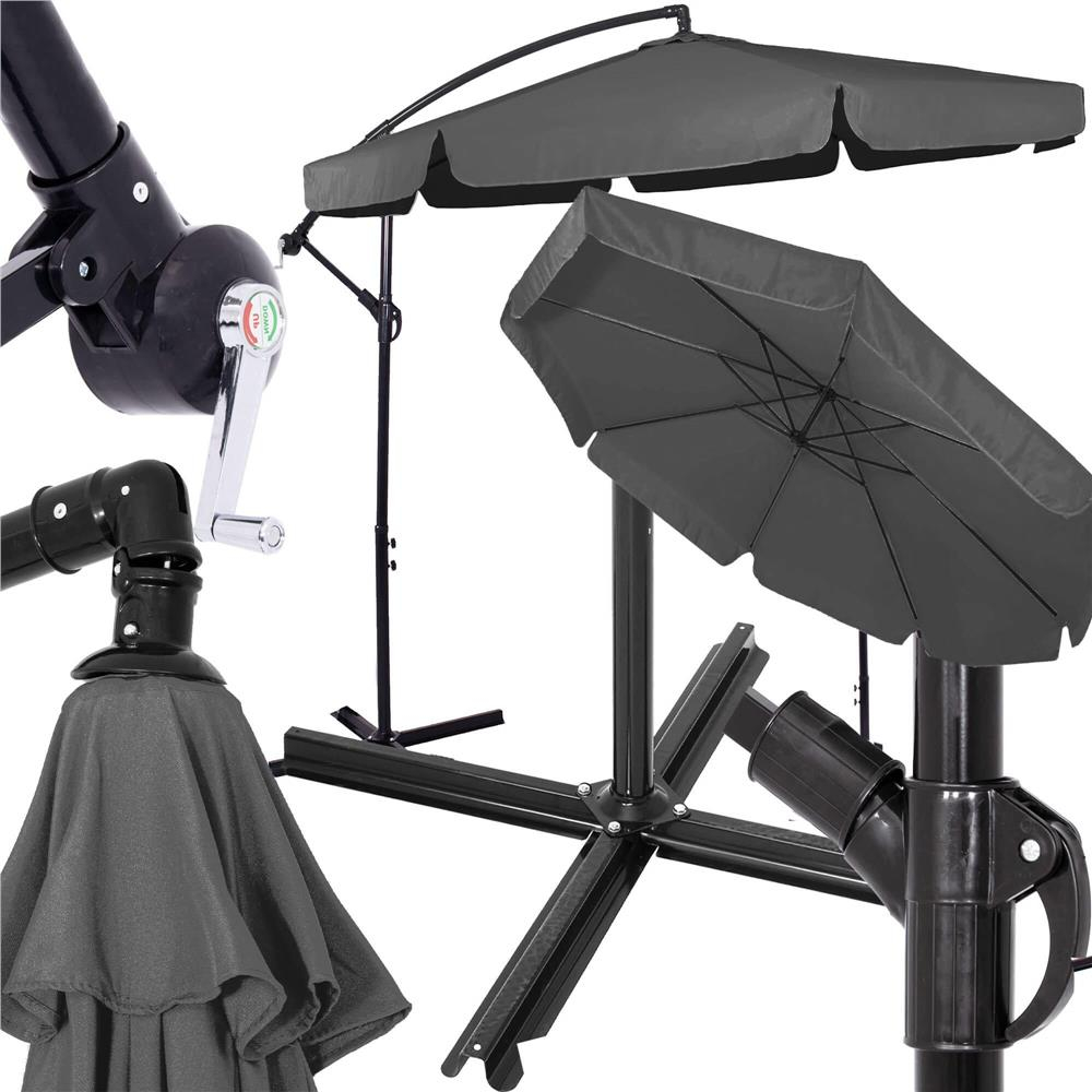 Informatii de baza: Material: otel, poliester Culoare baldachin: grafit Constructie: 8 panouri Culoarea cadrului: negru, vopsit cu pulbere Husa inclusa Mecanism: manivela Dimensiuni: Lungimea umbrelei: 290 cm Latimea materialului umbrelei (inclusiv volane): 350 cm Inaltime totala (cu baldachinul desfasurat plat): 262 cm Inaltime cu baldachinul pliat si bratul in jos: 275 cm Inaltime pana la structura de sub baldachin: 218 cm Lungime suport de baza: 100 cm Diametru orificiu de ventilatie: 33 cm Diametrul cantonului deasupra orificiului de ventilatie: aprox. 42 cm Inaltime picior de baza: 4 cm Latimea piciorului de baza: 10 cm Lungimea unui brat al bazei: 48 cm Lungimea bratului masurata in arc: aprox. 200 cm Lungimea catargului vertical: aprox Latimea unui panou la marginea baldachinului: 110 cm Lungime volan: aproximativ 25 cm Latimea volanului: 107 cm (masurata la jumatatea volanului) Lungime baldachin inchis: 160 cm Lungime manivela: 12 cm Lungimea manerului la catarg: 12 cm Diametru tub catarg: 48 mm Diametrul tubului bratului: 42 mm Profil tub baldachin: 14x18 mm Diametrul tubului care incoroneaza copertina (sub orificiul de ventilatie): 30 mm Lungimea tubului/structurii sub baldachin: 28 cm Dimensiuni coperta: 167 x 47 x 47 cm Diametrul mare al umbrelei va va permite sa umbriti si sa protejati o suprafata mare a terasei, balconului sau gradinii de soare sau de ploaia deranjanta, oferindu-va posibilitatea de a face gratare in voie, de a va juca cu copiii, de a gazdui un numar mare de persoane la o petrecere sau de a acoperi o piscina mare sau un loc de joaca. Umbrela este realizata din cele mai bune materiale. Cadrul din otel acoperit cu pulbere va va permite sa va bucurati cu succes de utilizare in multe sezoane de vara. Husa impermeabila a copertinei va va permite sa va adapostiti nu numai de soarele arzator, ci si de ploile neasteptate, care nu va vor mai intrerupe relaxarea linistita in gradina. Mecanism manivela eficient si solid pentru desfasurare si pliere in doar cateva secunde Husa practica si usoara - va proteja copertina atunci cand nu folositi umbrela Pentru a creste stabilitatea si siguranta, de exemplu, in cazul unor rafale de vant neasteptate, umbrela este echipata cu o baza larga, a carei deschidere este de pana la 100 cm. In plus, fiecare dintre picioarele sale este echipat cu gauri, datorita carora puteti folosi ancore sau suruburi speciale dedicate unei anumite suprafete pentru a atasa permanent baza intr-un loc convenabil. Forma elementelor de baza va permite, de asemenea, sa adaugati greutate suplimentara daca o considerati o solutie mai potrivita. IMPORTANT! Nu uitati sa nu lasati umbrela deschisa in caz de vant puternic.