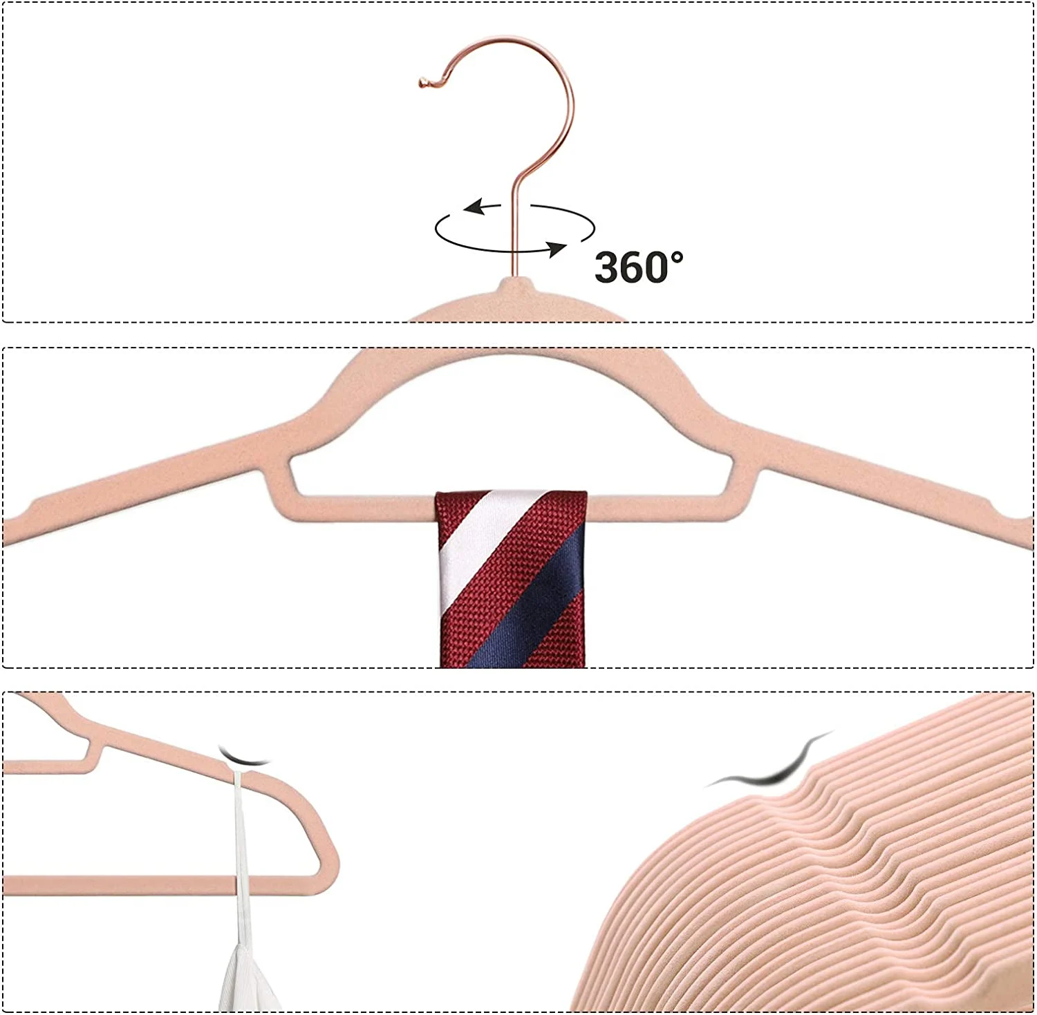 Culoare: Rose Gold + roz deschis Material: Metal acrilonitril butadiena stiren (ABS) Dimensiuni produs: 45 l x 23,5 h centimetri Caracteristica speciala: Antiderapant, Subtire Bucati incluse in set: 50 de bucati Despre acest articol Suprafata antiderapanta: Suprafata de catifea a umeraselor creste frecarea, iar canelurile antiderapante de pe umeri impiedica alunecarea hainelor - chiar si a camasilor de matase.Subtire, dar solid: Fabricate din plastic ABS durabil, aceste umerase de haine sunt subtiri, dar foarte rezistente; fiecare umeras are o capacitate de incarcare statica maxima de 5 kg, astfel incat chiar si paltoanele grele de iarna pot fi agatate fara probleme.Economie de spatiu: Fiecare cuier de catifea are un profil subtire, permitandu-va sa atarnati mai multe haine in acelasi spatiu de dulap; bara centrala poate fi folosita pentru esarfe sau cravate.Carlige din aur roz: Carligele stralucitoare din aur roz se rotesc la 360°, ajutandu-va sa va atarnati hainele in mod ordonat, adaugand in acelasi timp putina stralucire dulapului dvs.Un set de 50 de umerase de catifea de inalta calitate cu carlige stralucitoare din aur roz, rezistente si greu de rupt, si o modalitate mai buna de a va organiza garderoba.