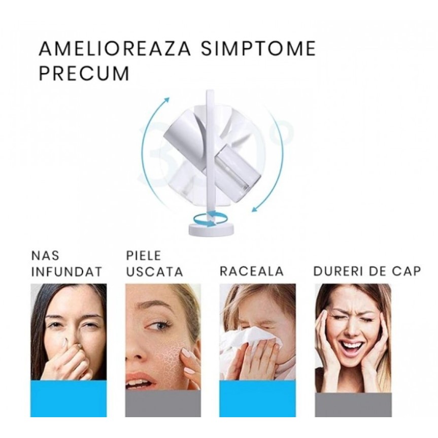 Functie umidificator: Amelioreaza aerul uscat din incapere si simptomele ce pot aparea, precum: nas infundat, piele uscata, raceala, dureri de cap.