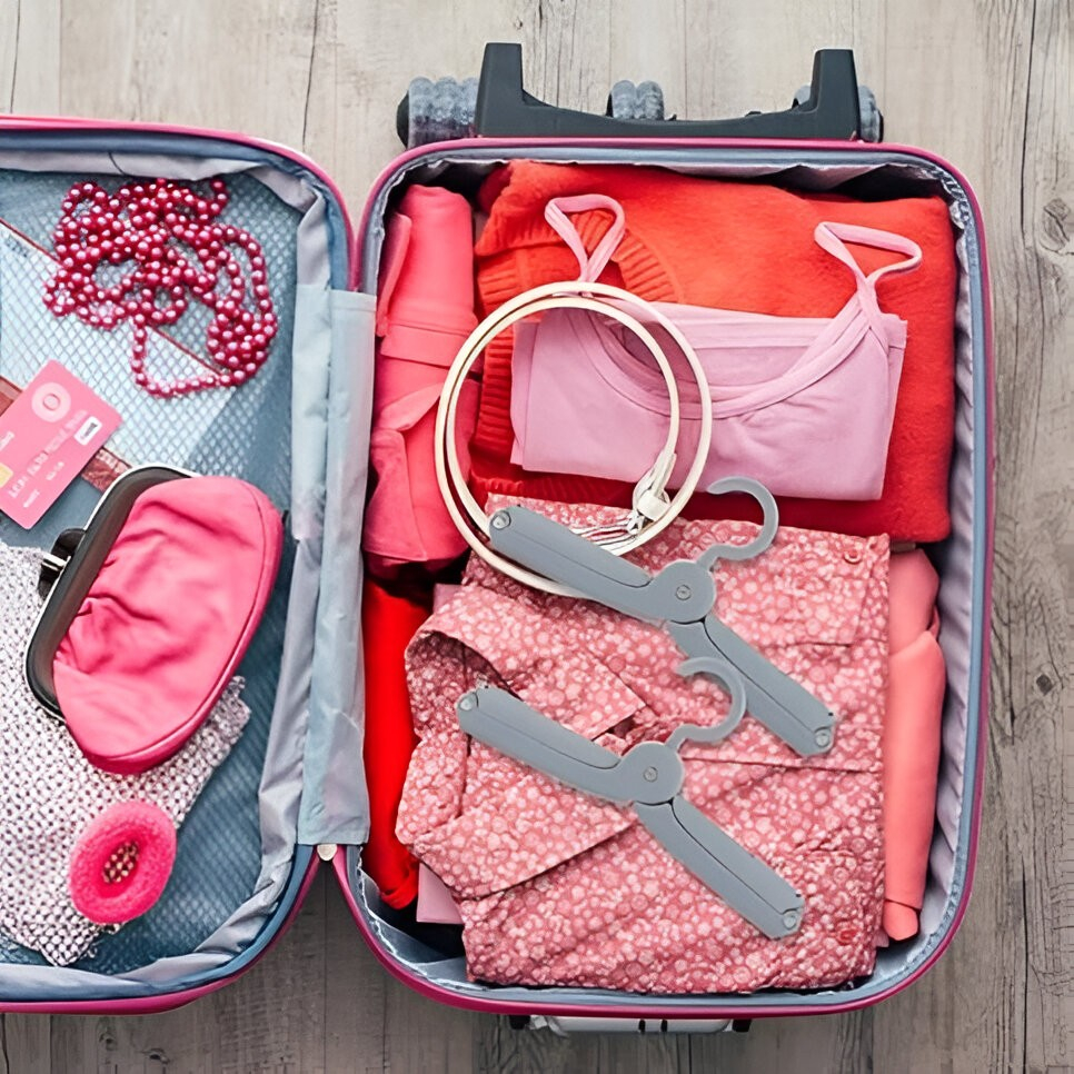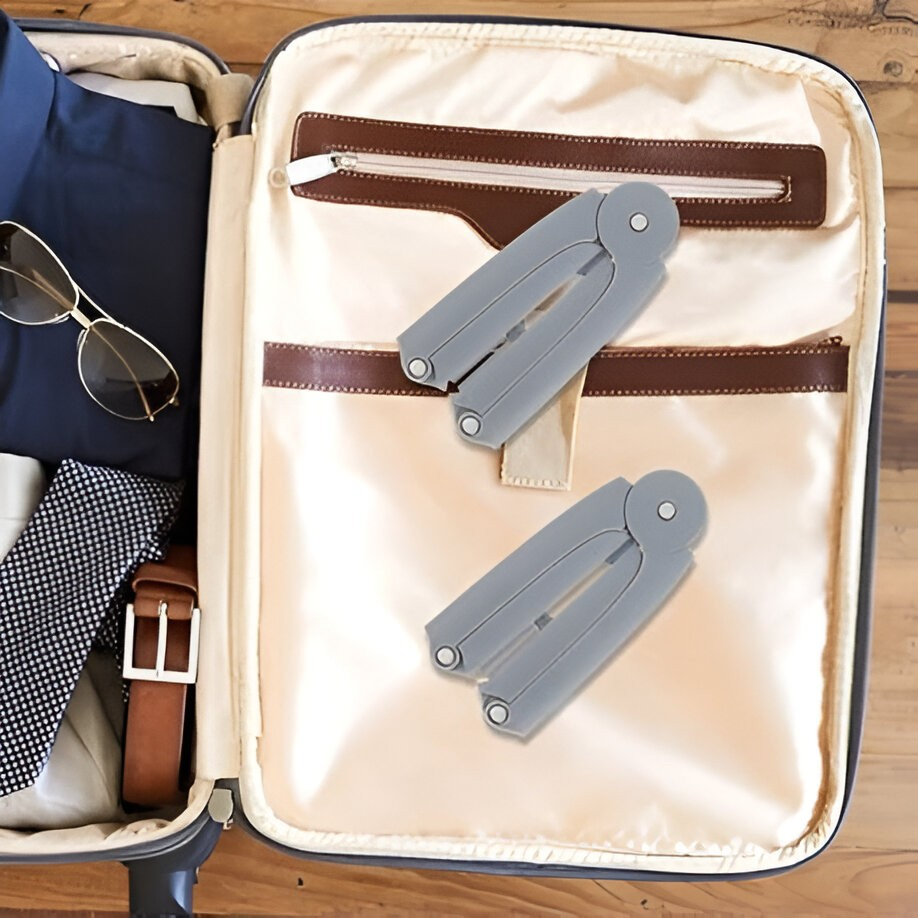 Acest umeraș poate fi pliat, astfel încât să poată fi depozitat în buzunarele mici ale genților de călătorie și ale bagajelor. Cu un profil subțire și compact, care vă ajută să economisiți spațiu în dulapul dvs.