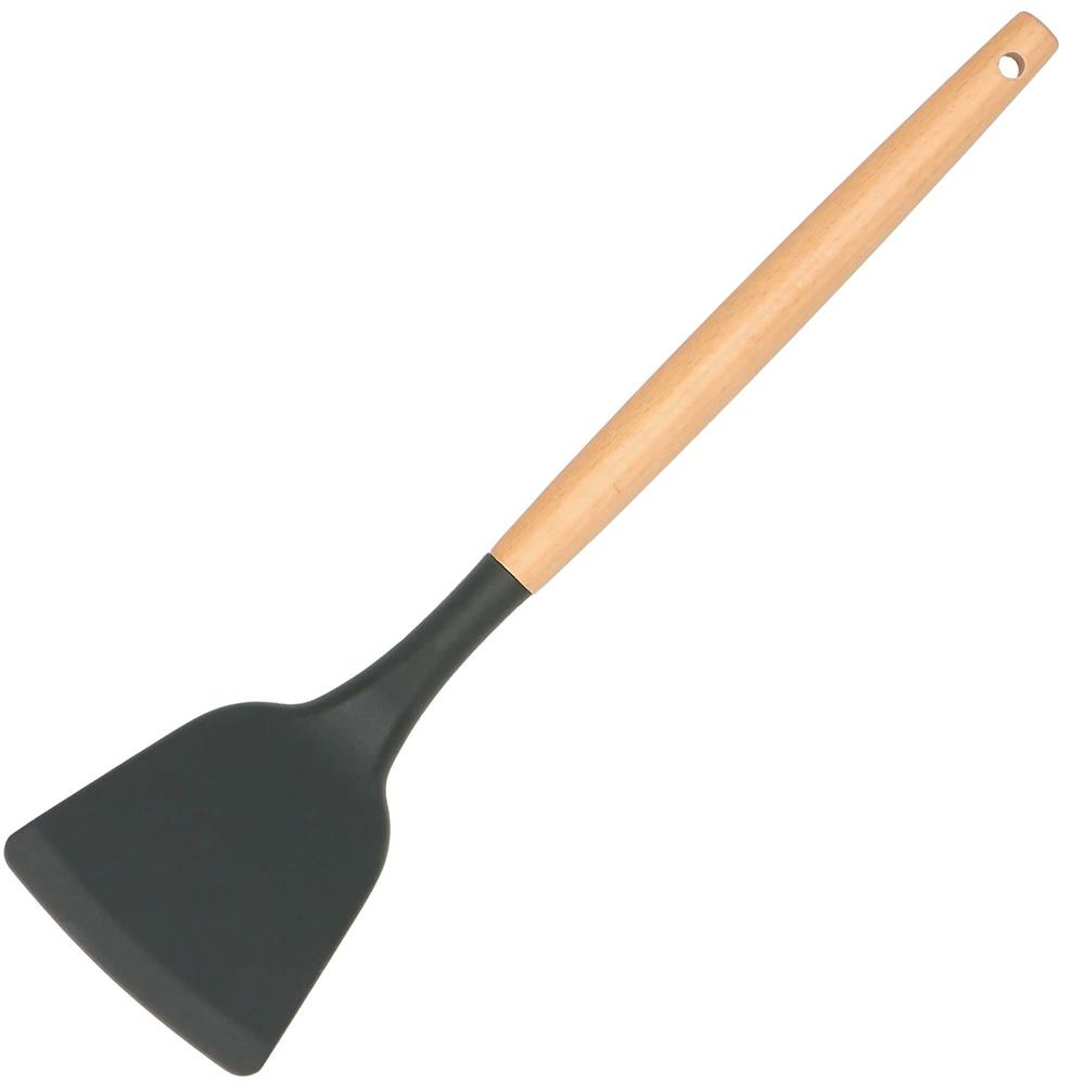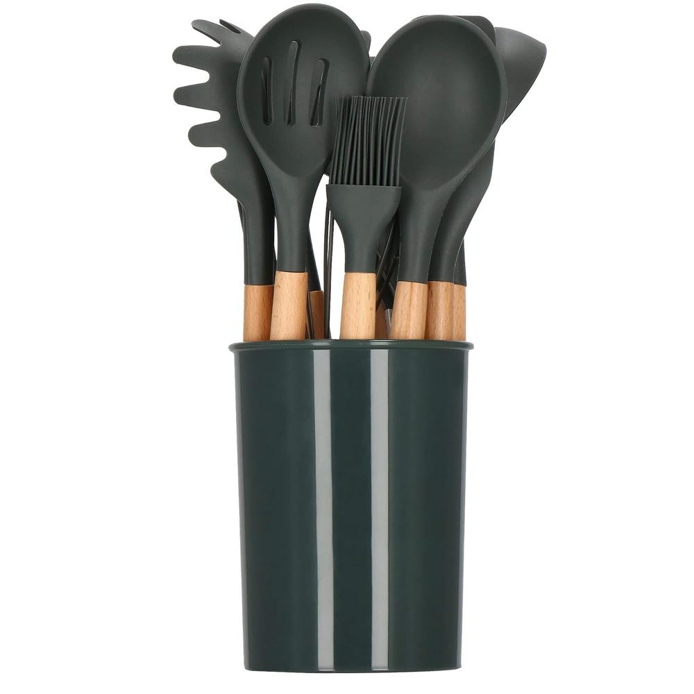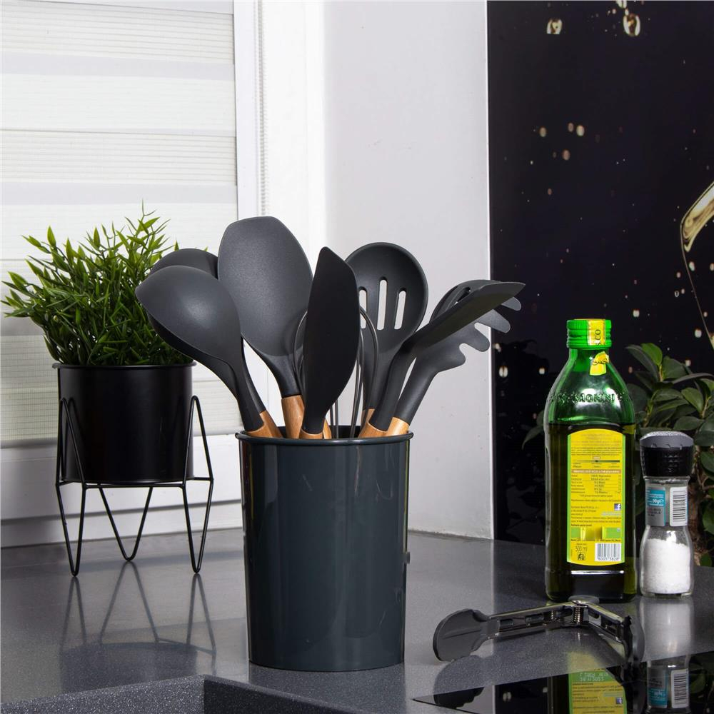 Set Sersimo 12 ustensile de bucatarie din silicon termorezistent si maner din bambus, gri