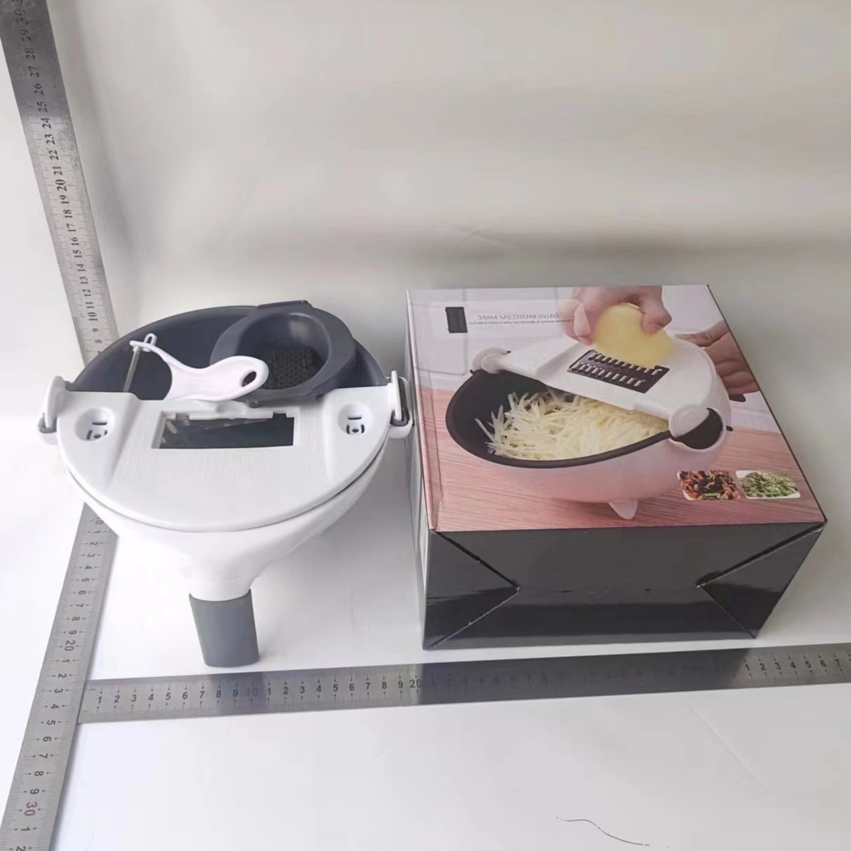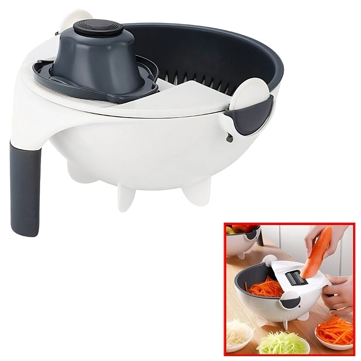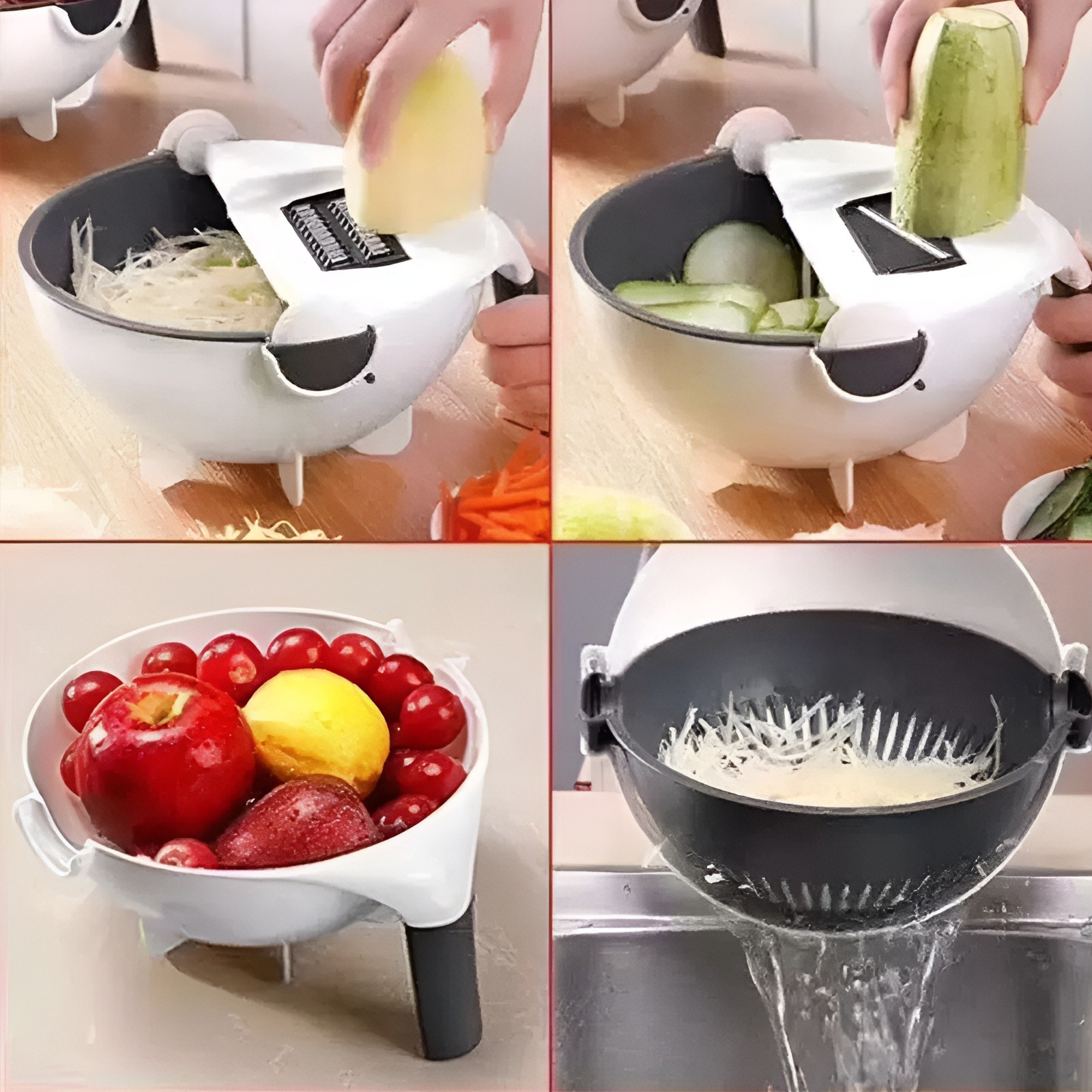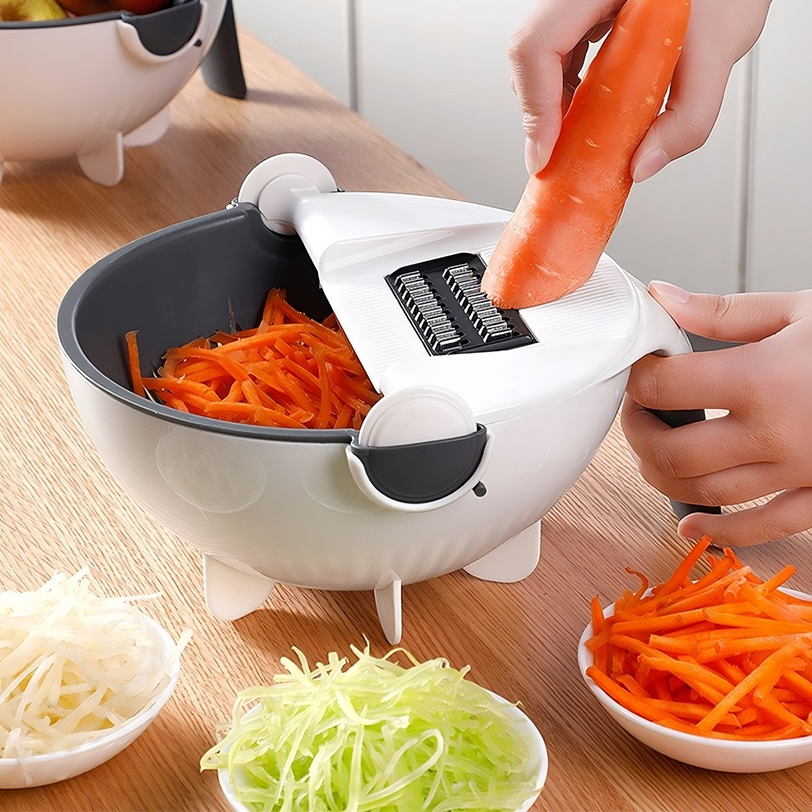 Pur și simplu feliați sau răzuiți alimentele și bucățile vor fi colectate în vas; clătiți-le imediat folosind strecurătoarea basculantă și detașabilă. Răzuiți brânza pe sandwich-uri, feliați castraveți pentru cocktail-uri, faceți morcovi julienne pentru salate deosebite, tăiați fin cartofii cu ușurință … posibilitățile culinare sunt interminabile!