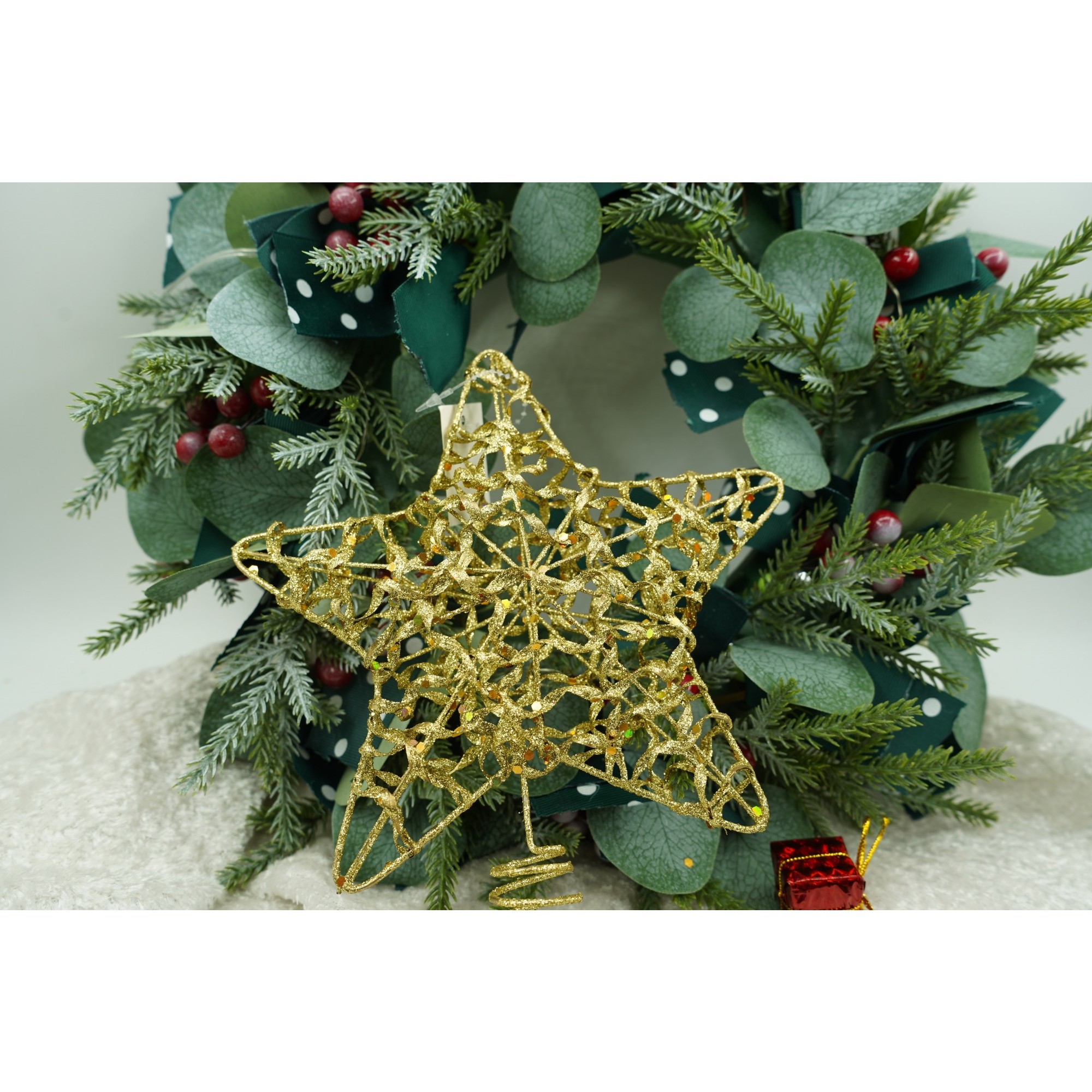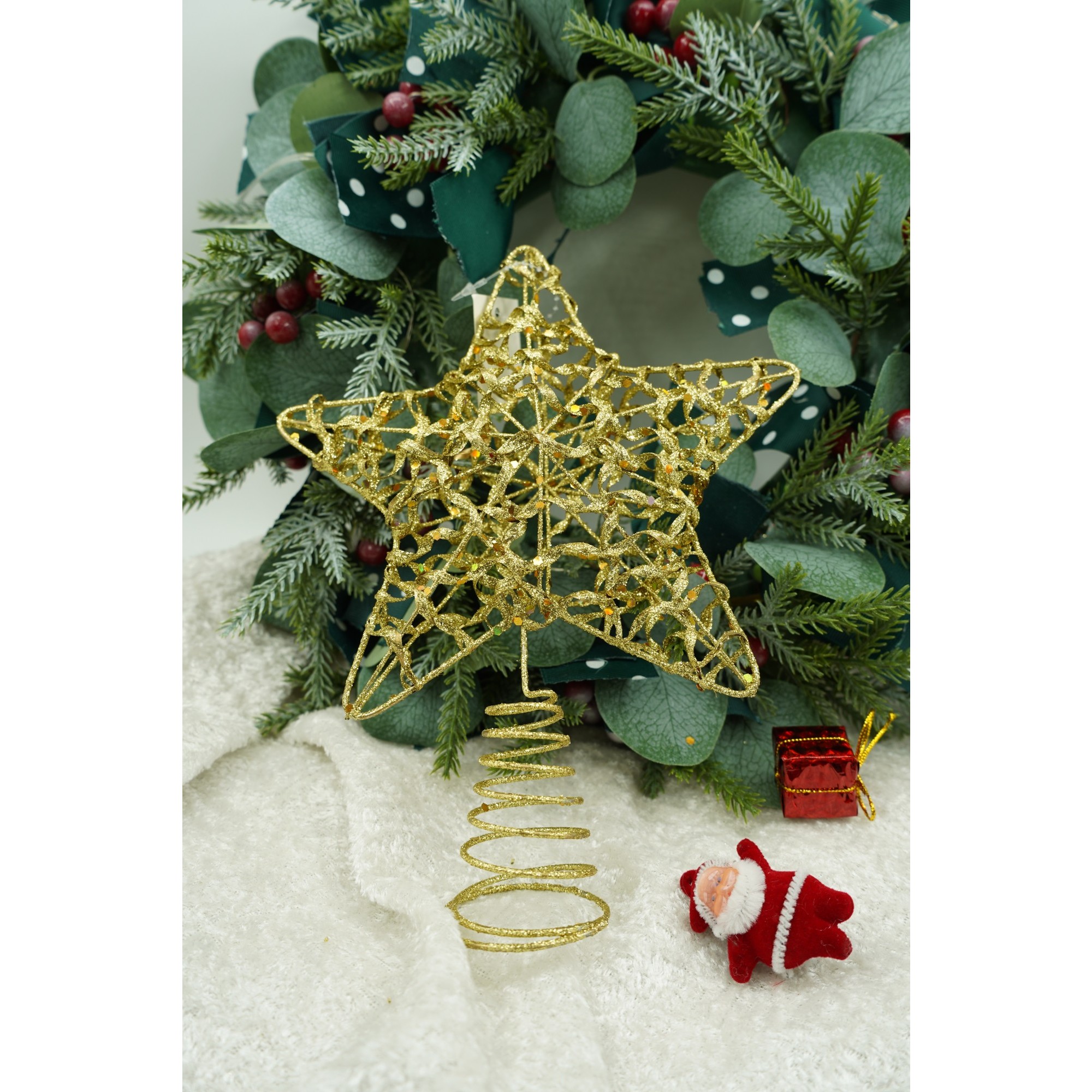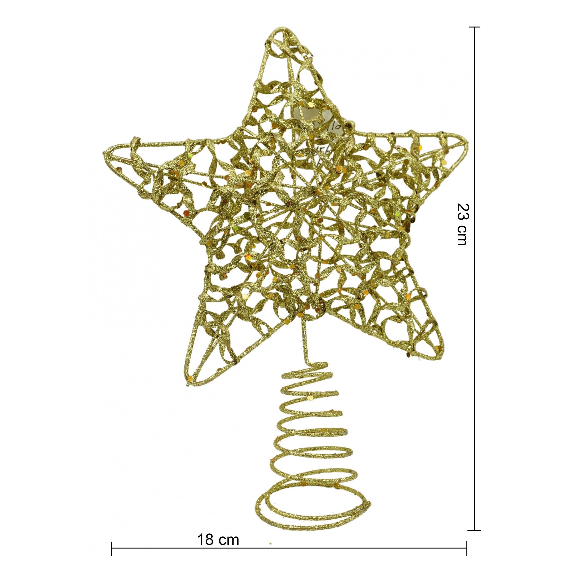 Varf decorativ de brad, Auriu, in forma de Stea, design cu paiete, din Plastic/Metal, 18 cm x 23 cm, Interior/Exterior,