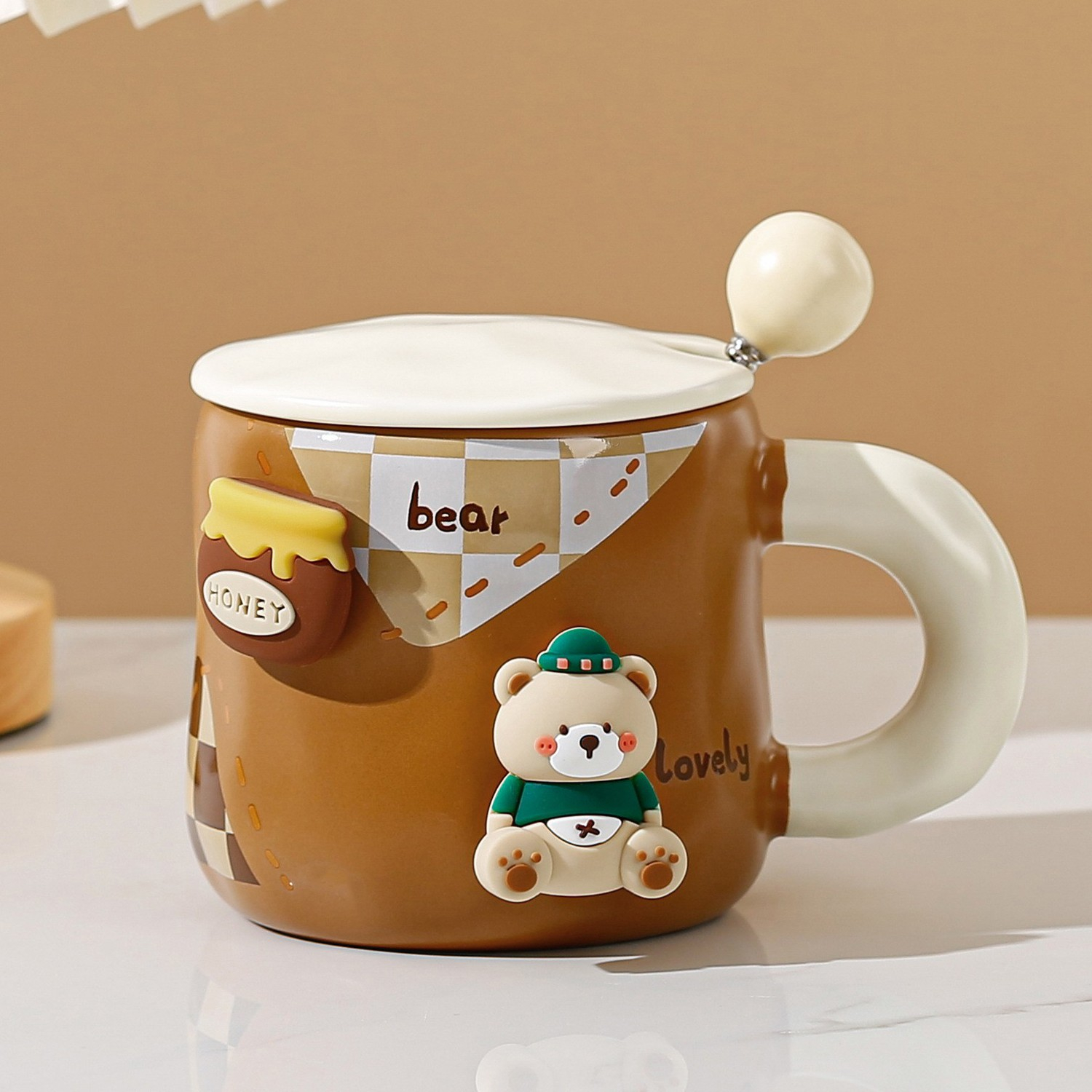 Cana din Ceramica, , Model Urs pentru Baieti, Cana Universala, Cana pentru Ceai, Cana cu Lingura Metalica si Capac